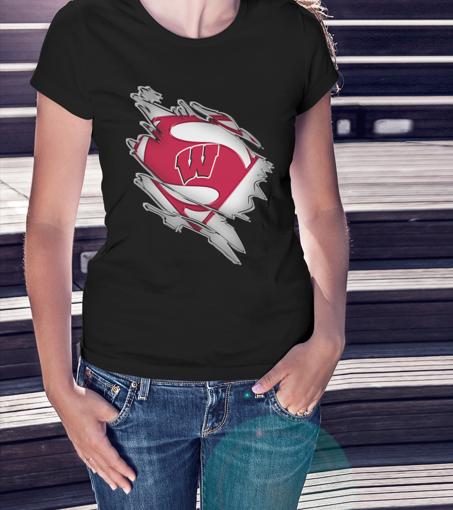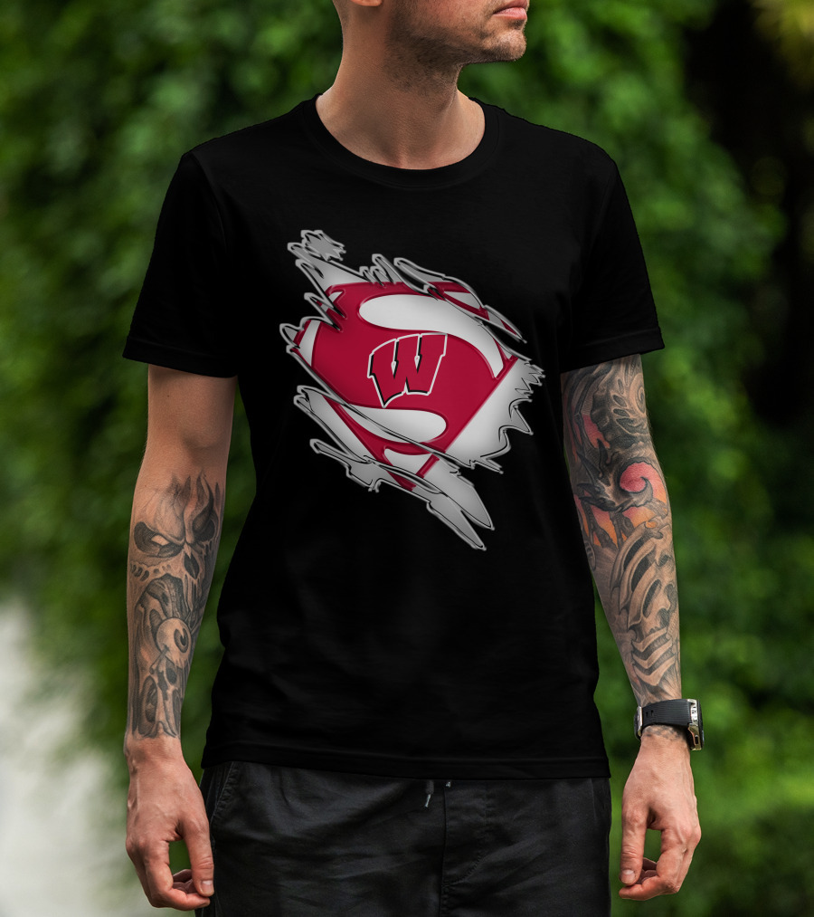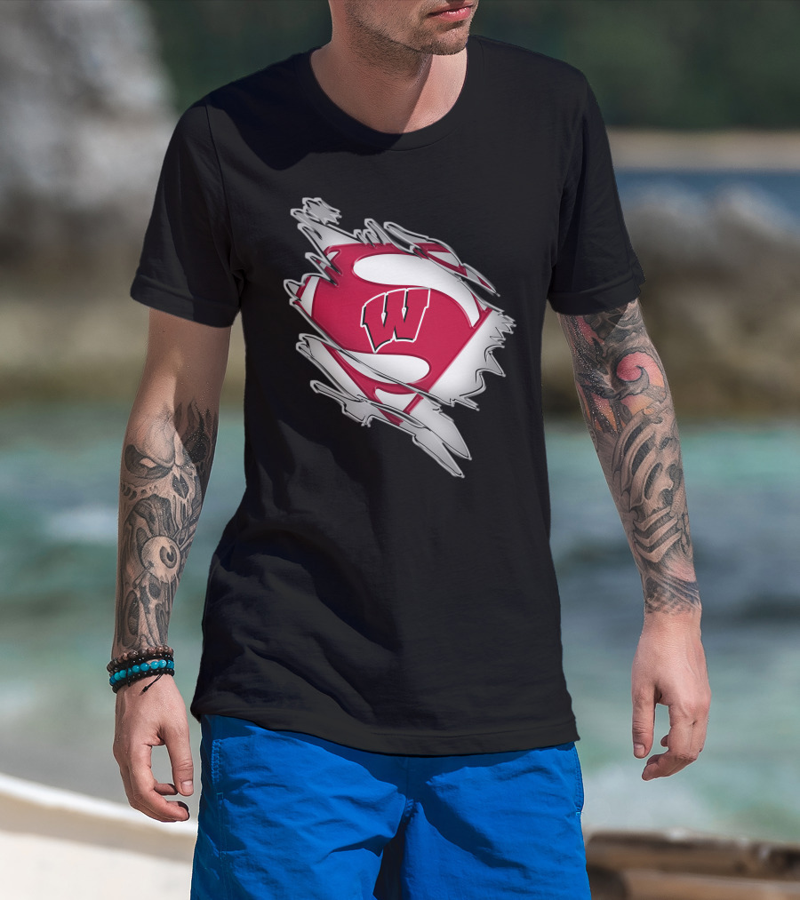 Wisconsin Badgers Super Man Emblem With W Inside Torn Fabric Effect T-Shirt