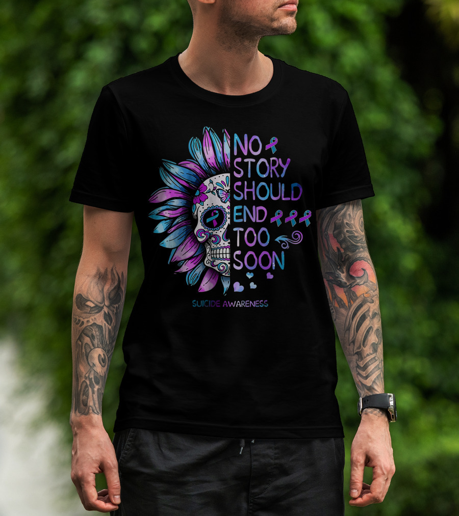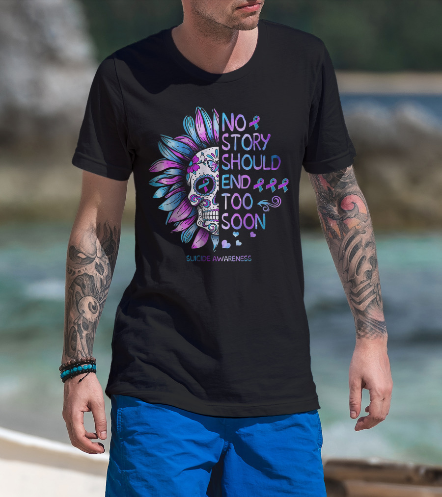 Women Suicide Awareness No Story Should End Too Soon Ribbon Skull T-Shirt