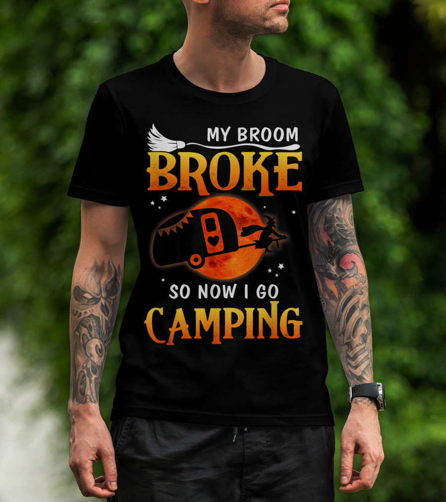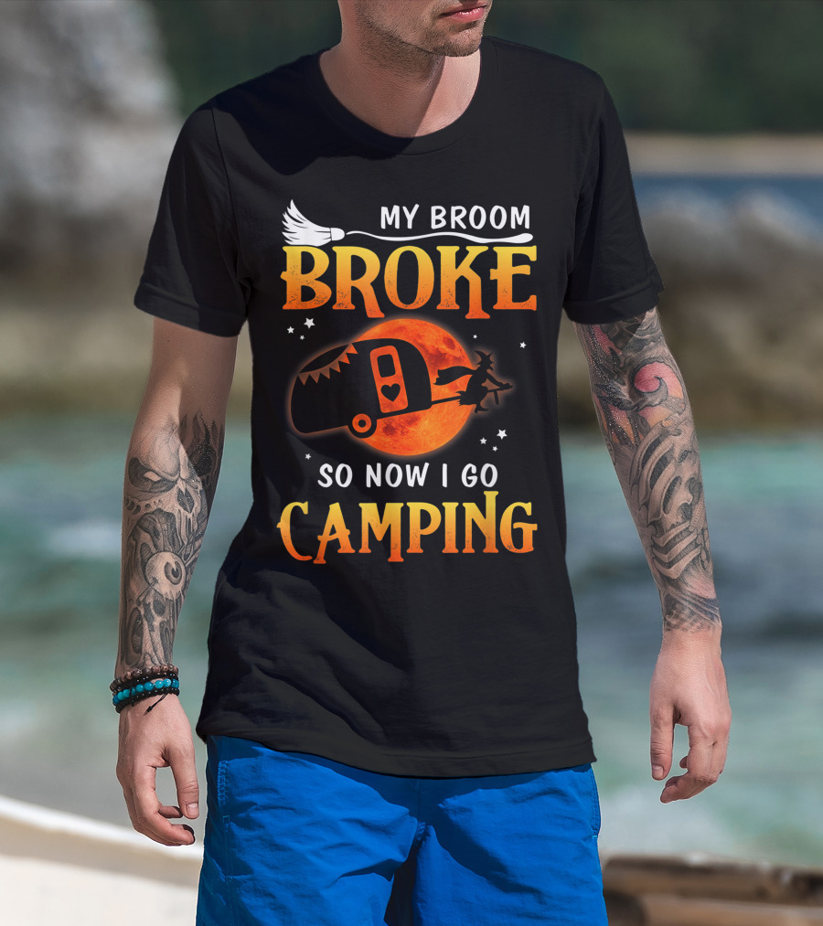 My Broom Broke Now I Go Camping Funny Halloween Moon Witch T-Shirt