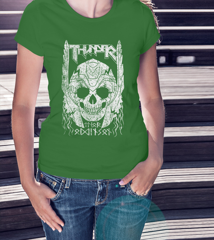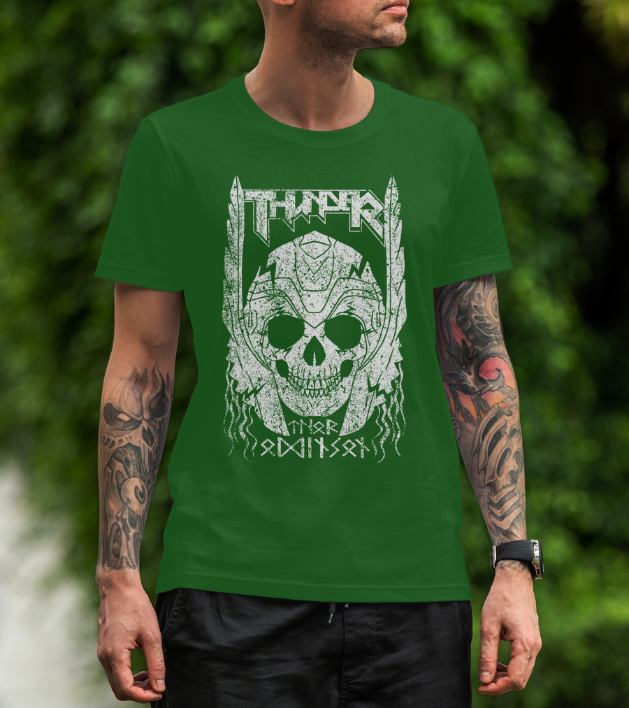 The THUNDER Thor Odin Son Skull T-shirt is designed for everyday wear and a consistent fit. Fabric is pre-shrunk ring-spun cotton with durable stitching. See the size chart below for exact measurements.