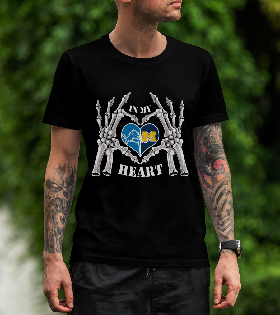 In My Heart Lions Wolverines M Logo Skeleton Hands T-Shirt