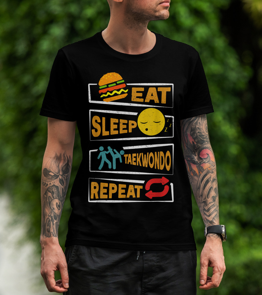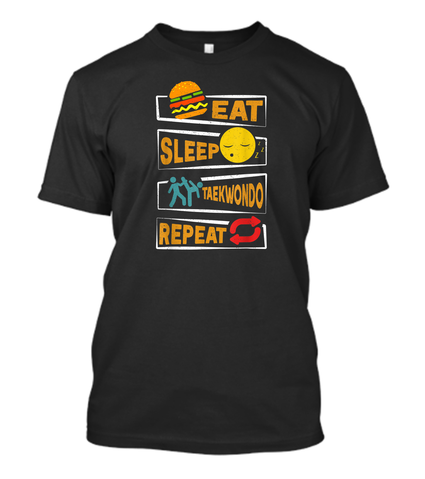 The Eat Sleep Taekwondo Repeat Funny Taekwondo Emoji Style with Burger and Sleep T-shirt is designed for everyday wear and a consistent fit. Fabric is pre-shrunk ring-spun cotton with durable stitching. See the size chart below for exact measurements.