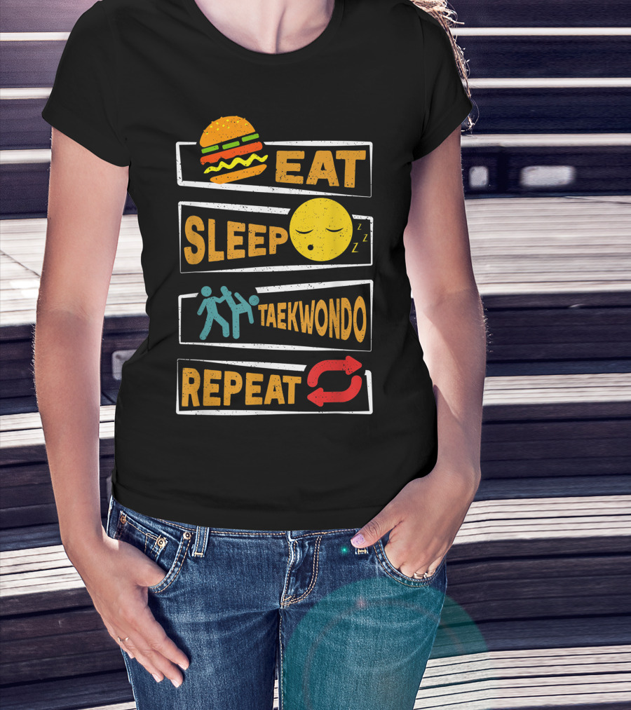 How much will this Eat Sleep Taekwondo Repeat Funny Taekwondo Emoji Style with Burger and Sleep shirt shrink?