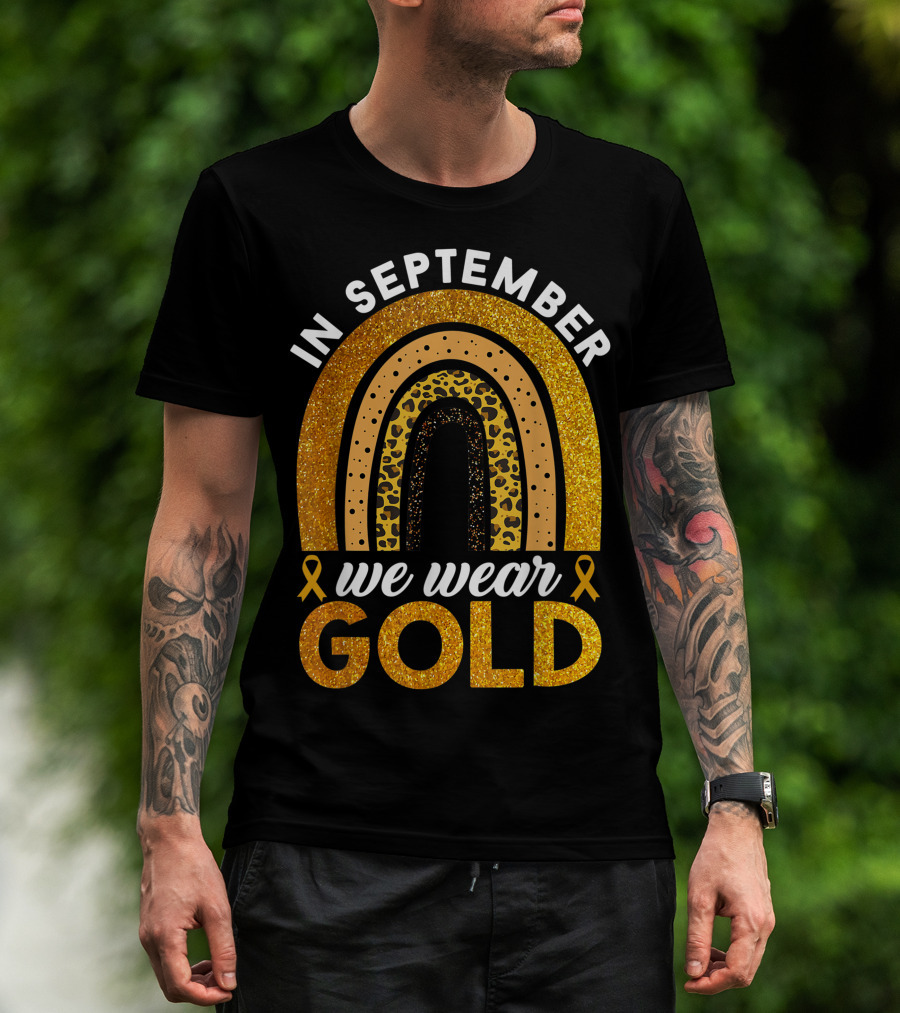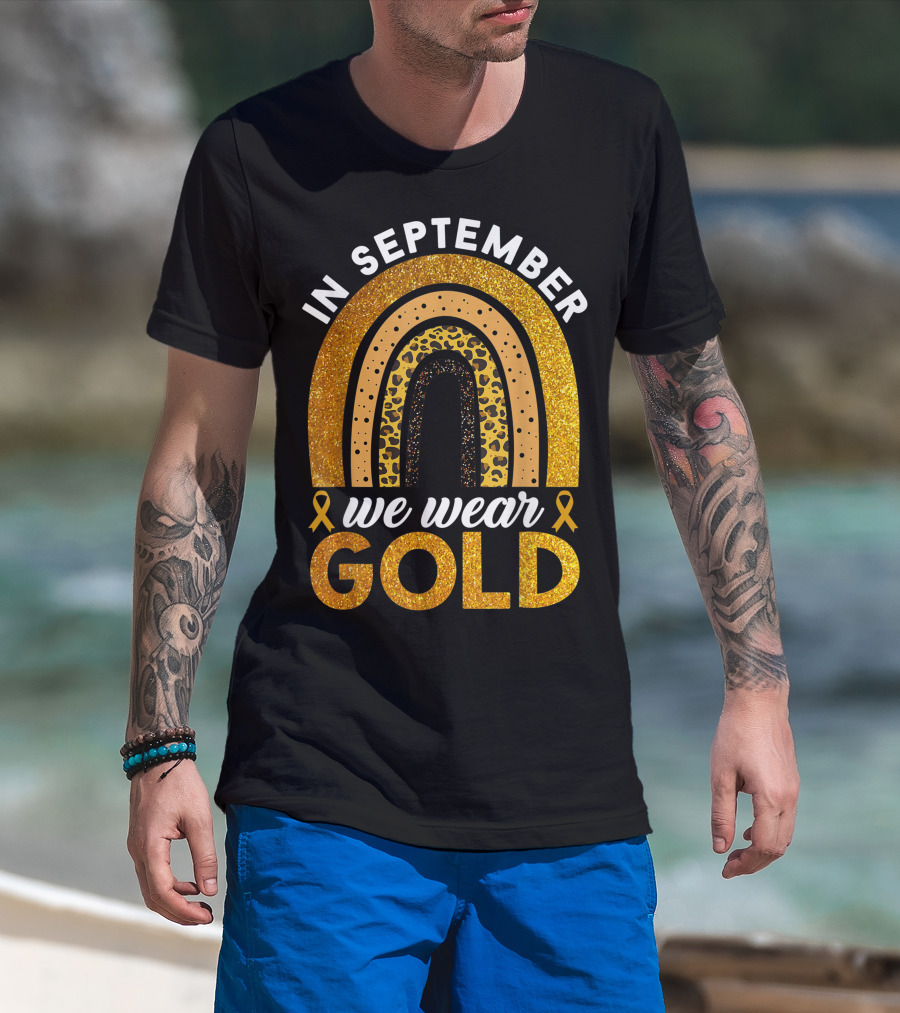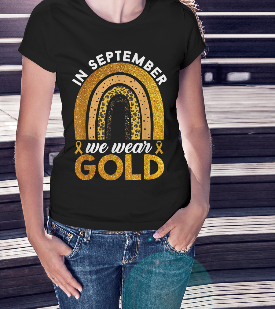 In September We Wear Gold Rainbow Childhood Cancer Awareness Glitter Gold Ribbons T-Shirt