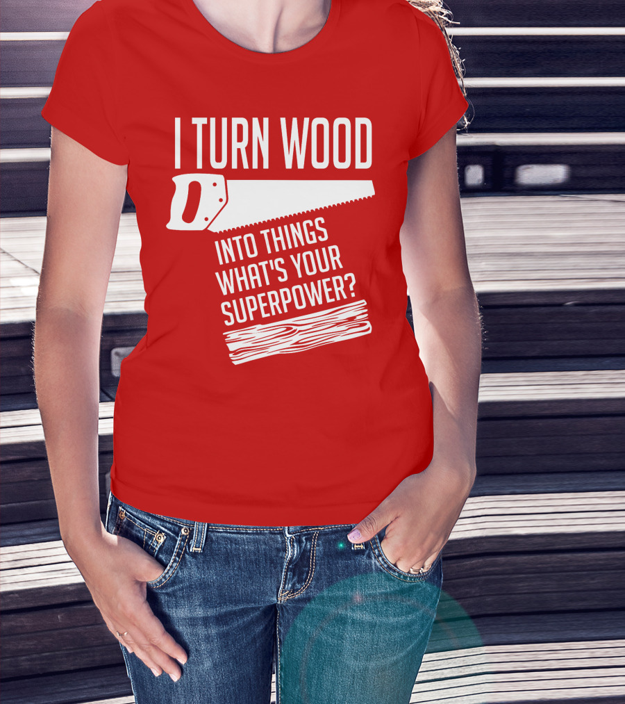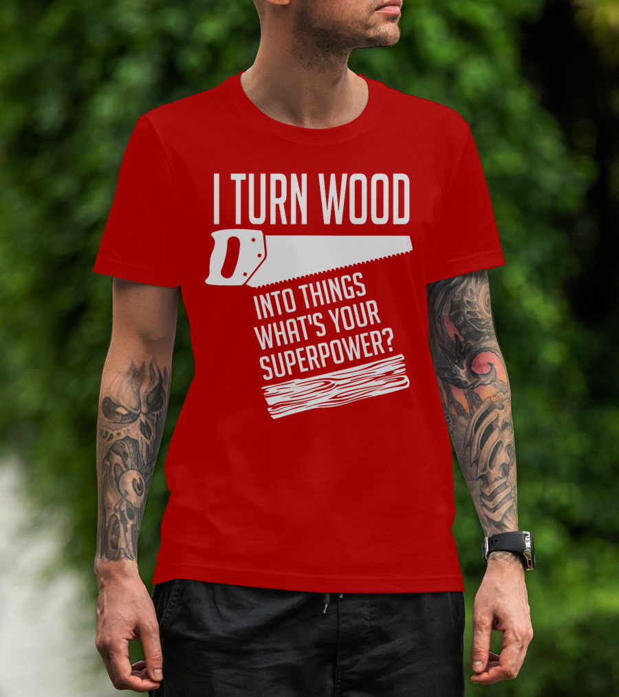 The I Turn Wood Into Things What's Your Superpower Saw Woodworker T-shirt is designed for everyday wear and a consistent fit. Fabric is pre-shrunk ring-spun cotton with durable stitching. See the size chart below for exact measurements.
