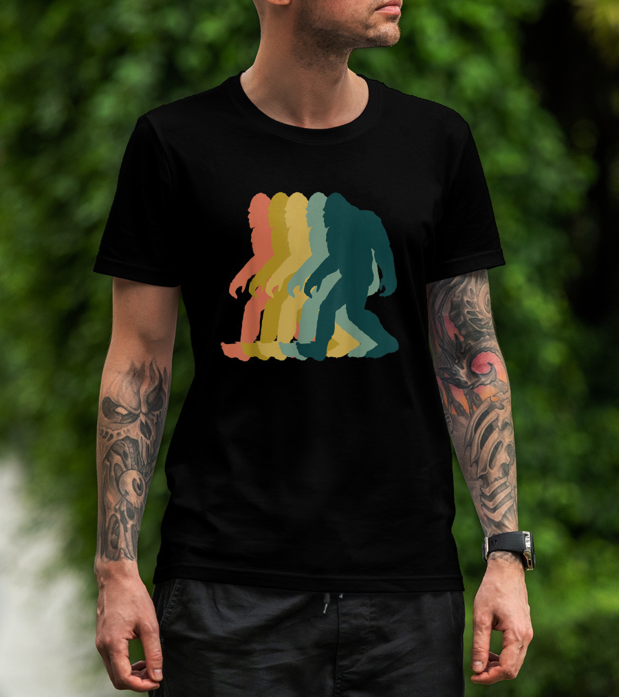 The Vintage Retro Rainbow Walking Bigfoot Silhouette 1970s T-shirt is designed for everyday wear and a consistent fit. Fabric is pre-shrunk ring-spun cotton with durable stitching. See the size chart below for exact measurements.