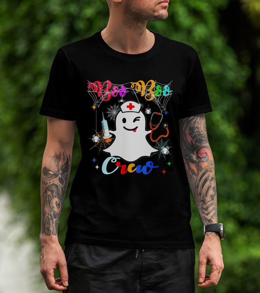 How much will this Boo Boo Crew Ghost Nurse Winking with Stethoscope and Syringe Halloween Spider Webs shirt shrink?