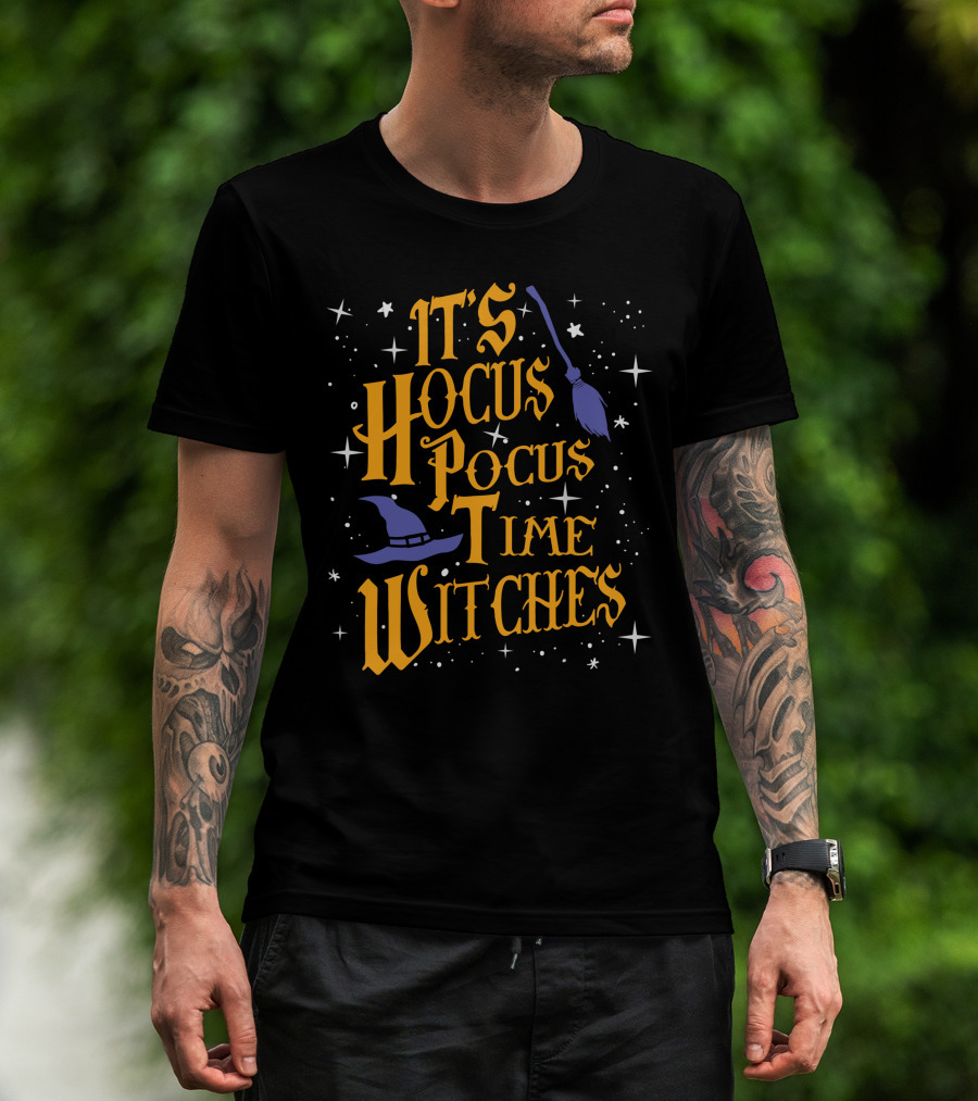 Halloween It's Hocus Pocus Time Witches With Stars Broom And Hat T-Shirt