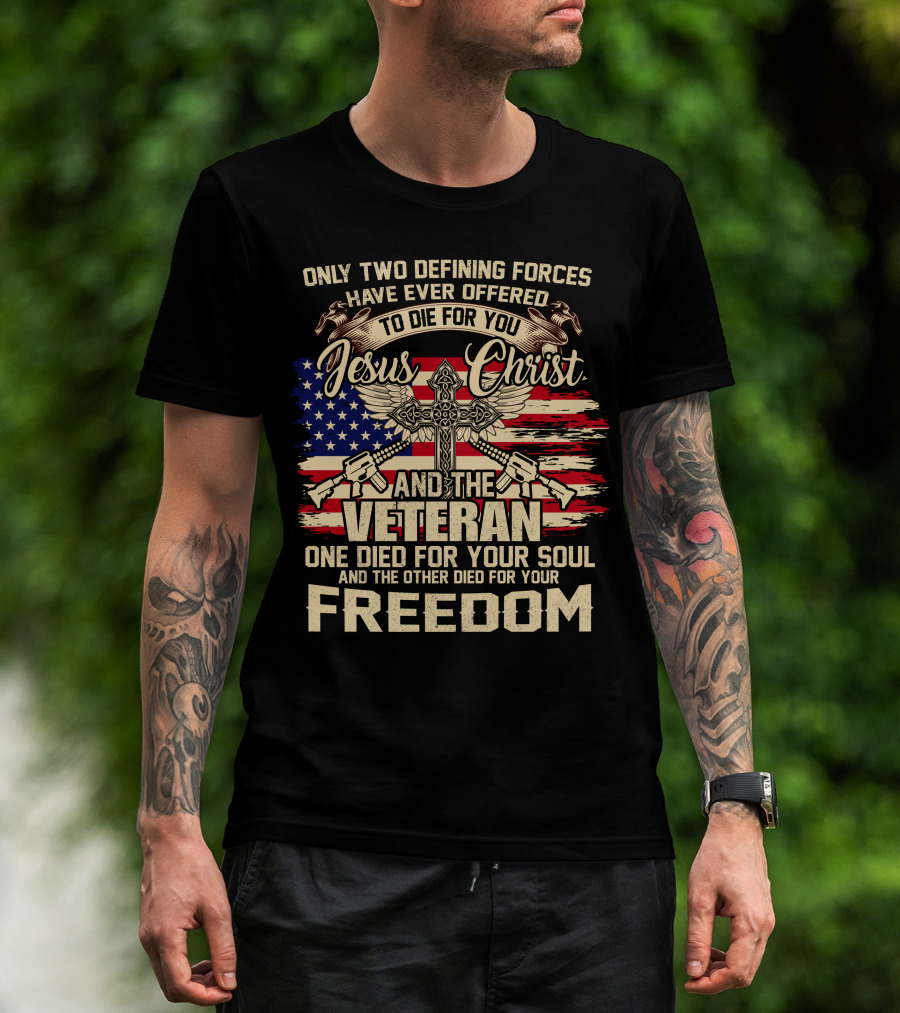 Only Two Defining Forces Have Ever Offered To Die For You Jesus Christ And The Veteran One Died For Your Soul And The Other Died For Your Freedom American Flag Cross T-Shirt