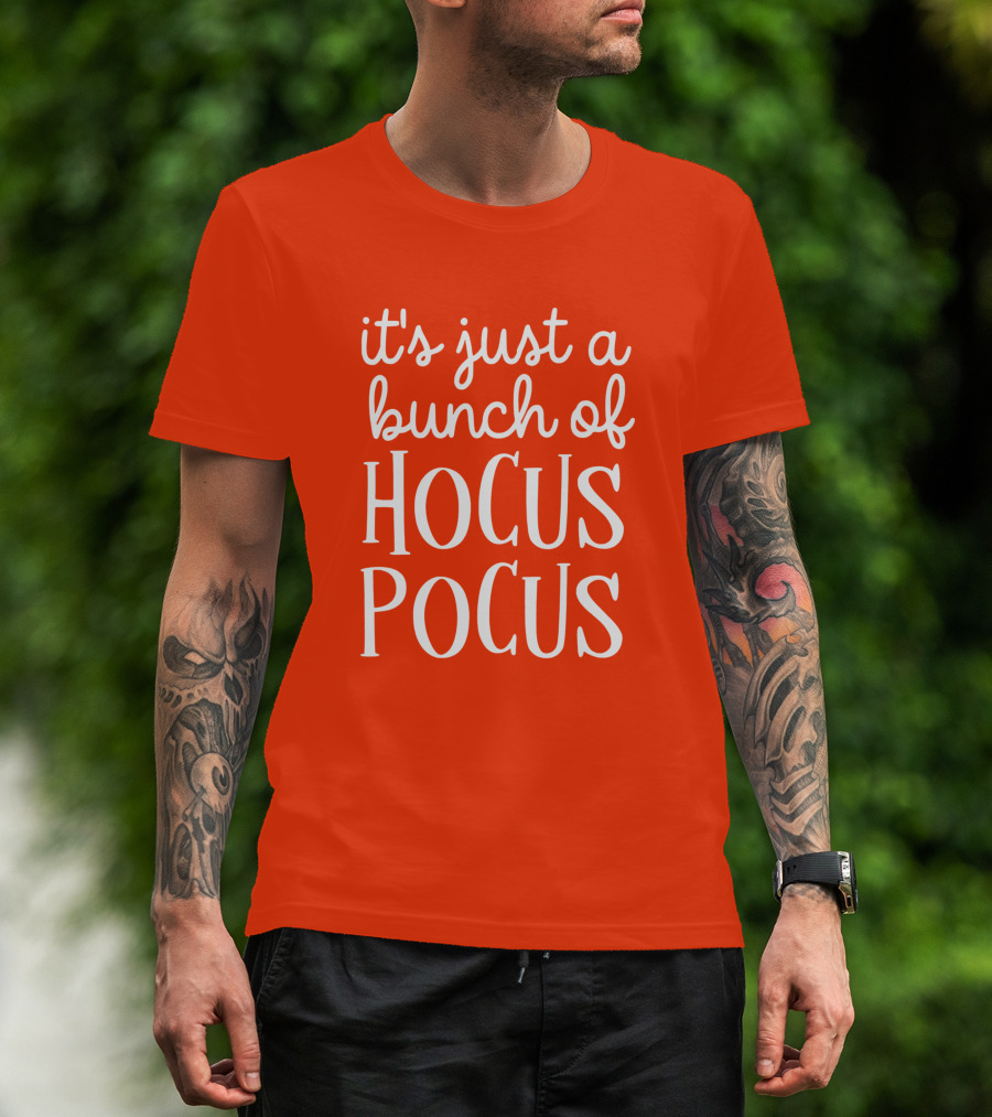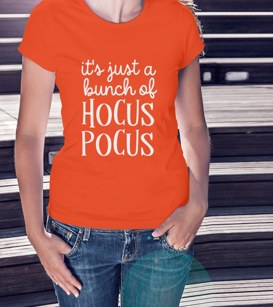 The It's Just a Bunch of Hocus Pocus Halloween Witch T-shirt is designed for everyday wear and a consistent fit. Fabric is pre-shrunk ring-spun cotton with durable stitching. See the size chart below for exact measurements.