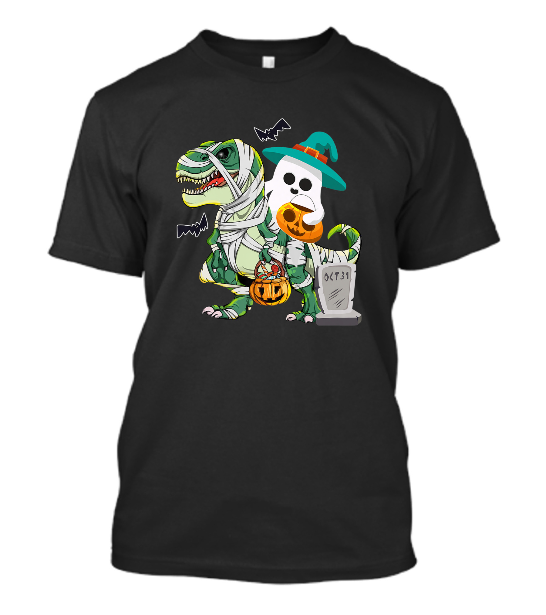 The Ghostly Mummy Dinosaur with Pumpkin Candy and Oct 31 Tombstone T-shirt is designed for everyday wear and a consistent fit. Fabric is pre-shrunk ring-spun cotton with durable stitching. See the size chart below for exact measurements.