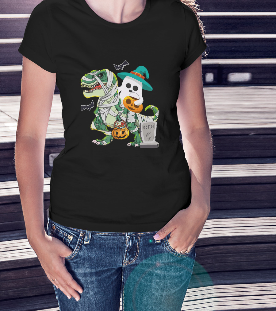 Ghostly Mummy Dinosaur With Pumpkin Candy And Oct 31 Tombstone T-Shirt