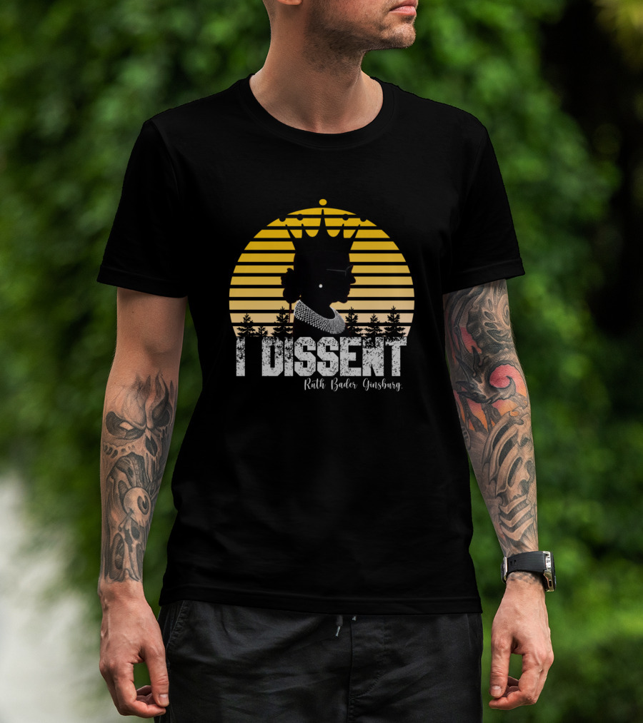 The I Dissent Ruth Bader Ginsburg Silhouette with Crown and Collar Sunset Background T-shirt is designed for everyday wear and a consistent fit. Fabric is pre-shrunk ring-spun cotton with durable stitching. See the size chart below for exact measurements.