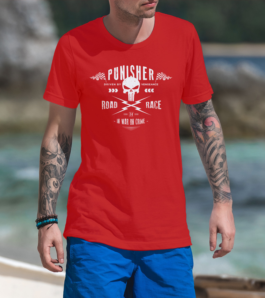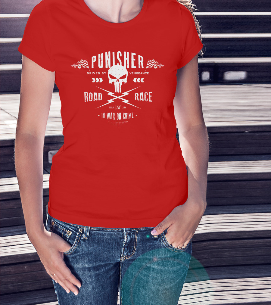 The Punisher Driven by Vengeance Road Race In War on Crime T-shirt is designed for everyday wear and a consistent fit. Fabric is pre-shrunk ring-spun cotton with durable stitching. See the size chart below for exact measurements.