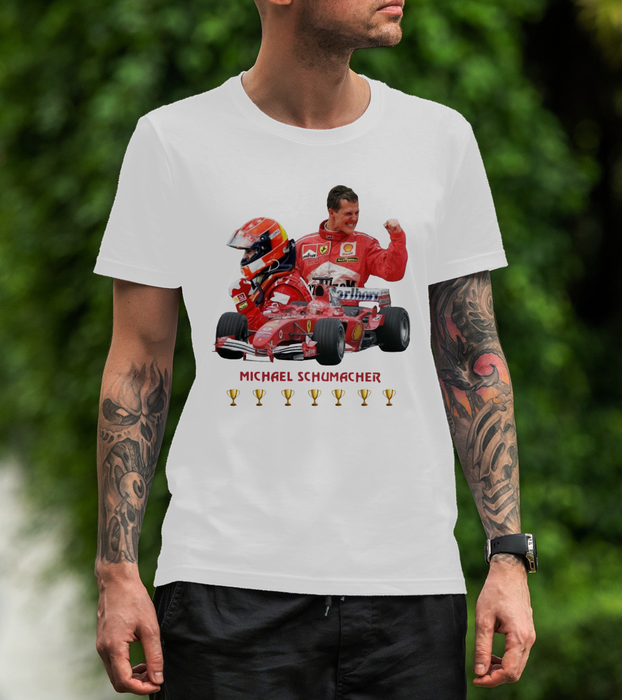 The Michael Schumacher Ferrari Racing Champion Thank You For The Memories T-shirt is designed for everyday wear and a consistent fit. Fabric is pre-shrunk ring-spun cotton with durable stitching. See the size chart below for exact measurements.