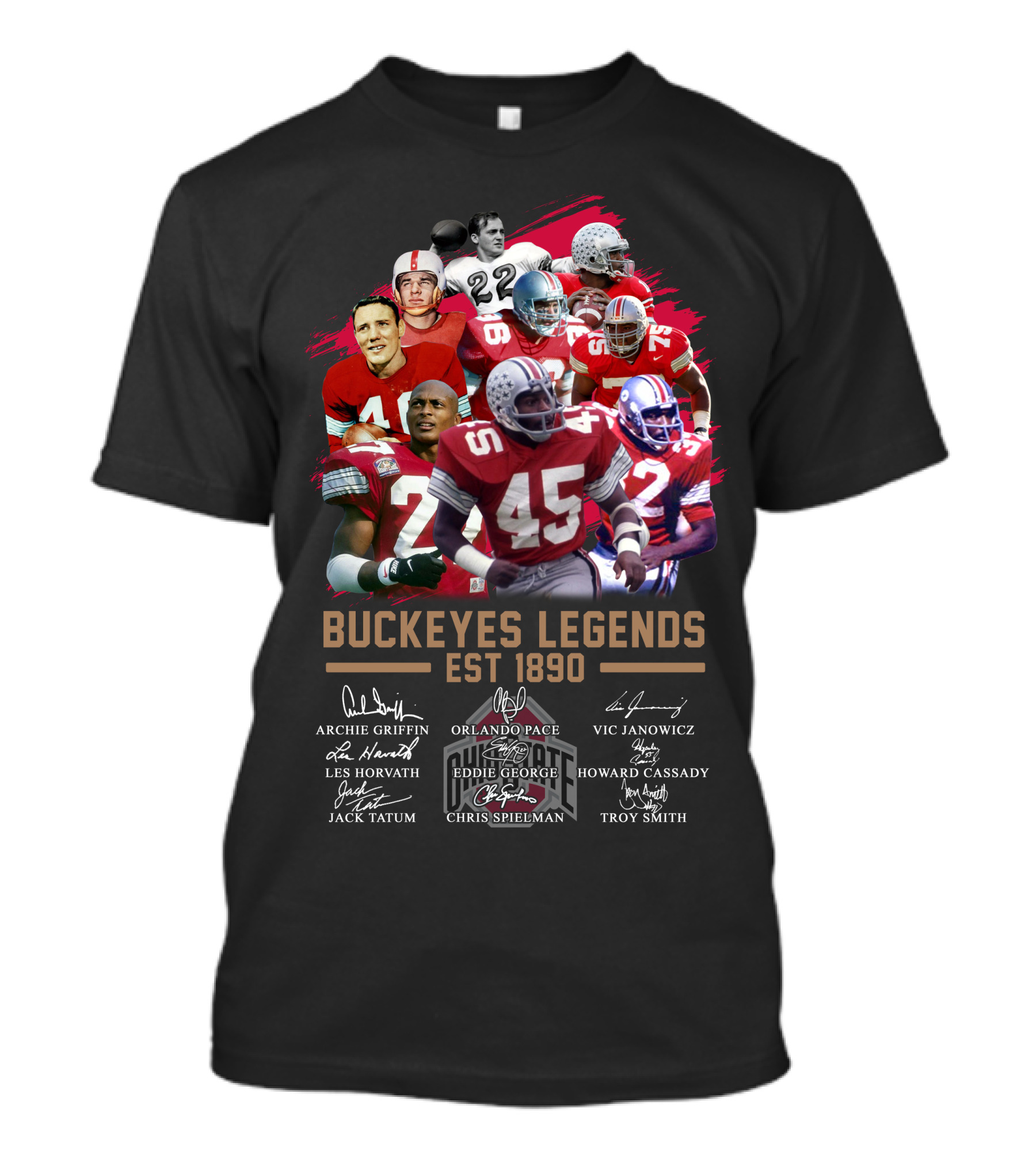 BUCKEYES LEGENDS EST 1890 ARCHIE GRIFFIN ORLANDO PACE VIC JANOWICZ LES HORVATH HOWARD CASSADY JACK TATUM EDDIE GEORGE TROY SMITH CHRIS SPIELMAN T-Shirt