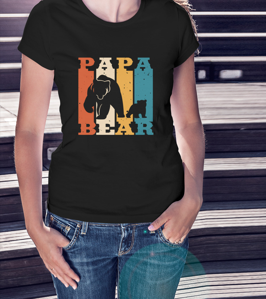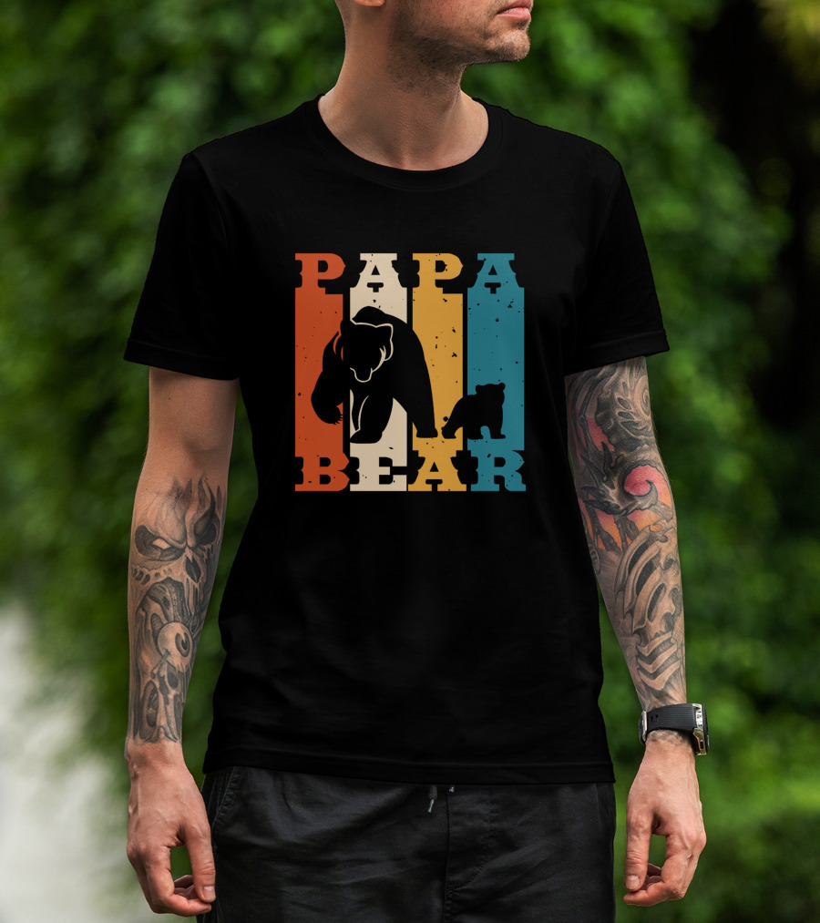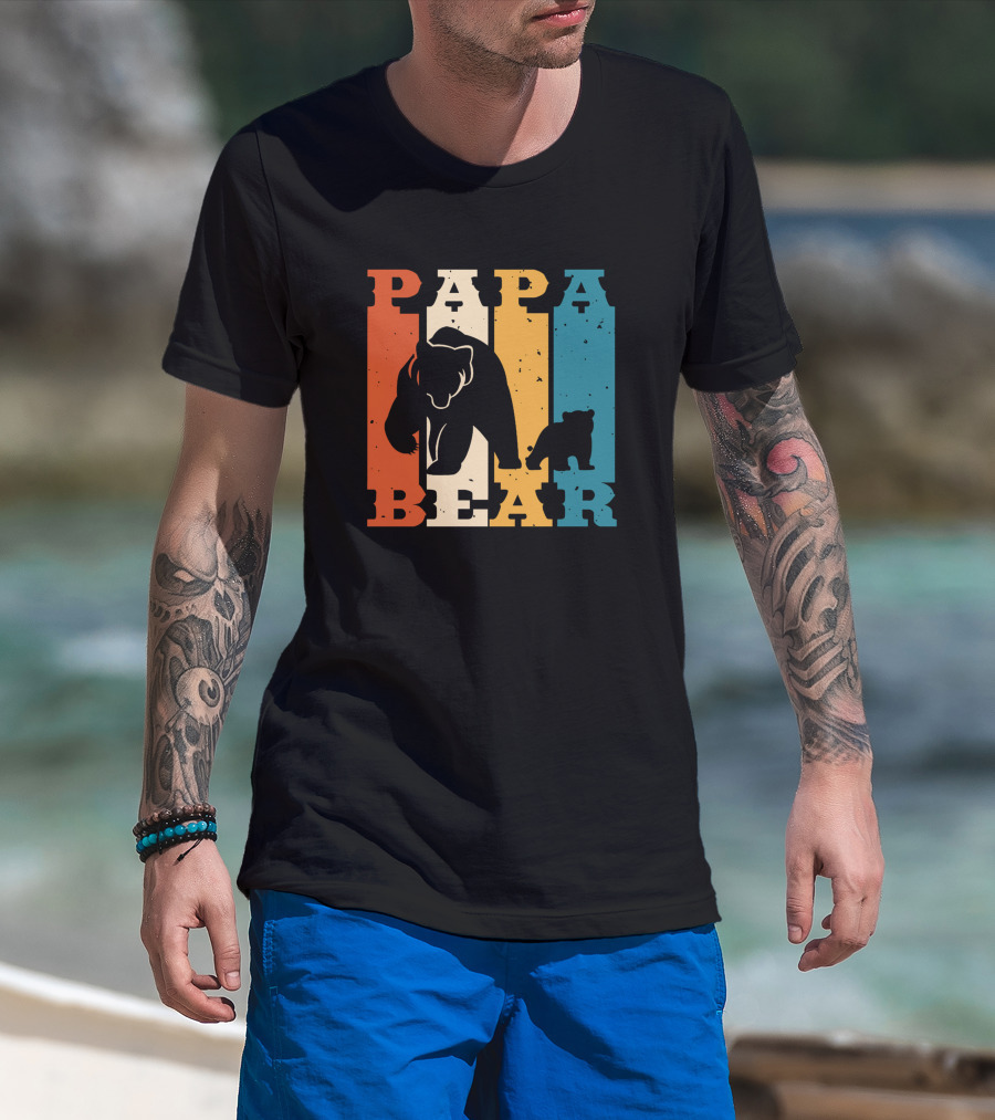 The Papa Bear Daddy Bear Retro Striped T-shirt is designed for everyday wear and a consistent fit. Fabric is pre-shrunk ring-spun cotton with durable stitching. See the size chart below for exact measurements.