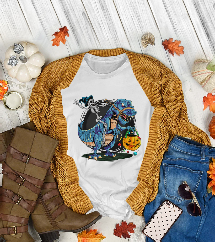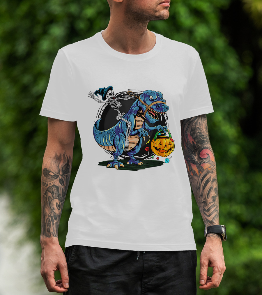 Skeleton Riding Dinosaur Halloween Candy Pumpkin Monster T-Shirt