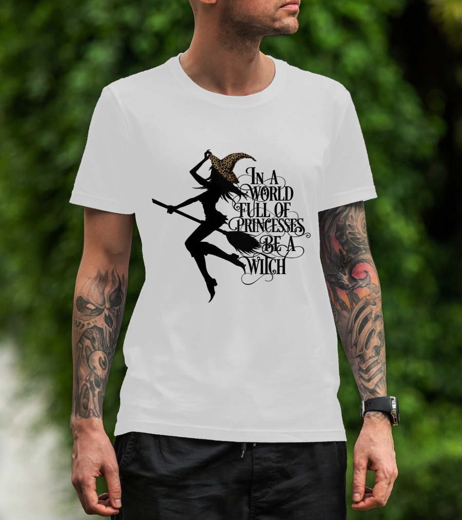 In A World Full Of Princesses Be A Witch Silhouette With Broom And Leopard Print Hat T-Shirt