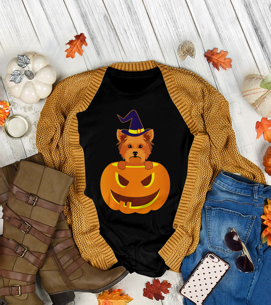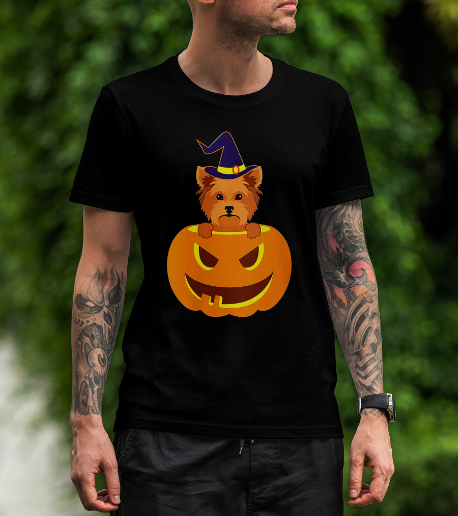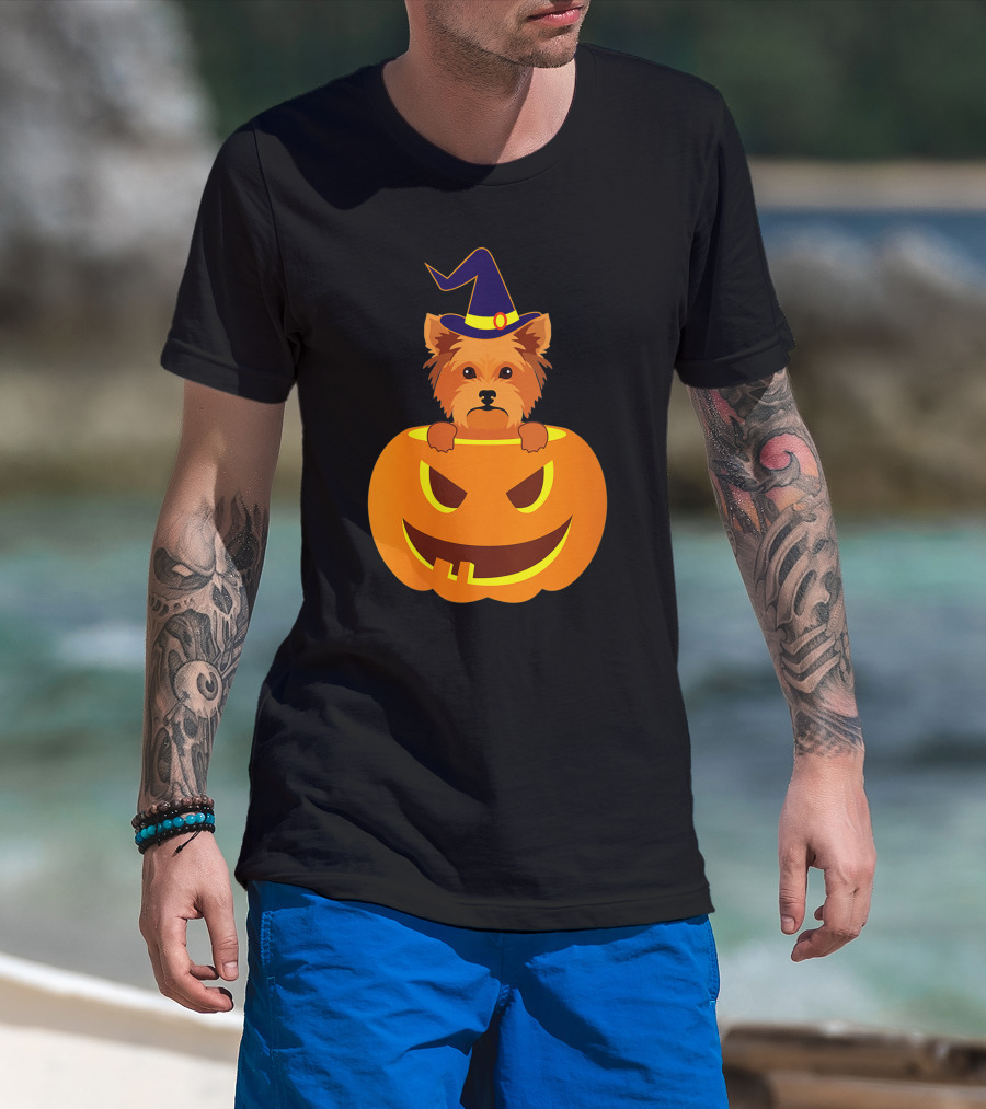 Yorkie Witch Hat Pumpkin Halloween Yorkshire Terrier T-Shirt