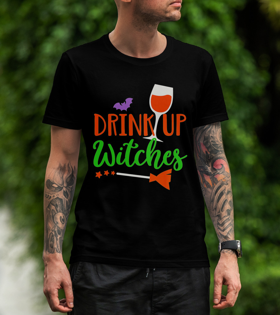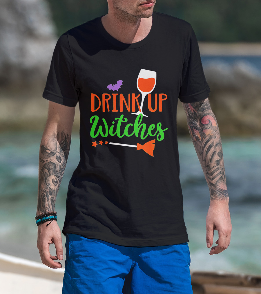 Drink Up Witches Halloween Vintage Family Wine Glass Broomstick Bat T-Shirt