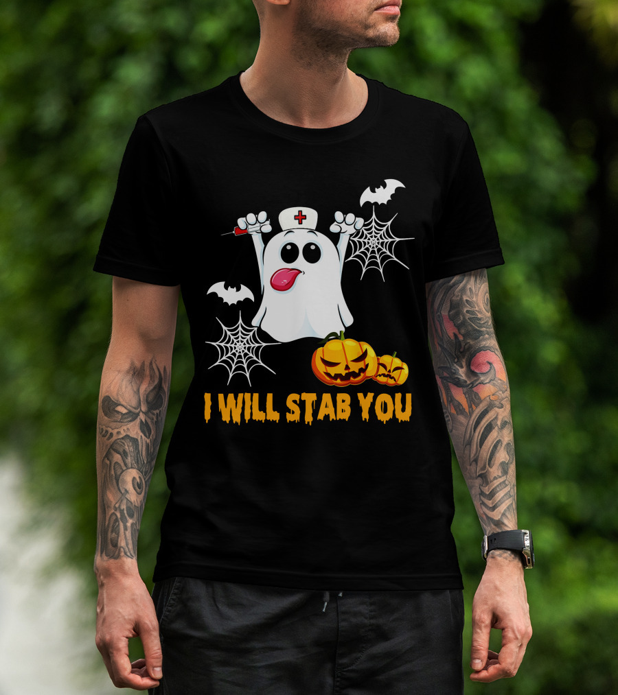 I Will Stab You Funny Nurse Ghost With Pumpkins And Bats T-Shirt