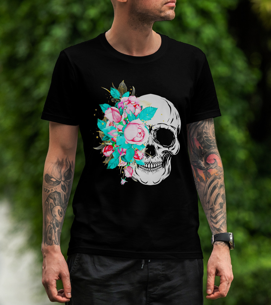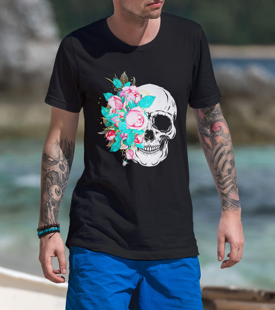 Flower Skull Floral Fusion With Vintage Rose Elements T-Shirt