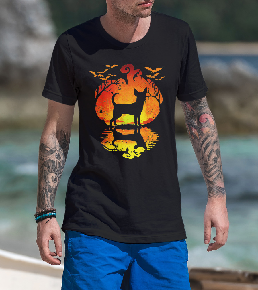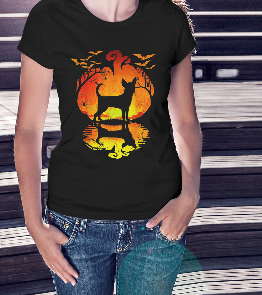 Chihuahua Dog Halloween Pumpkin Reflection With Bats And Trees T-Shirt