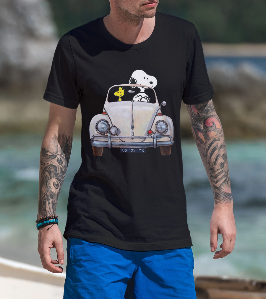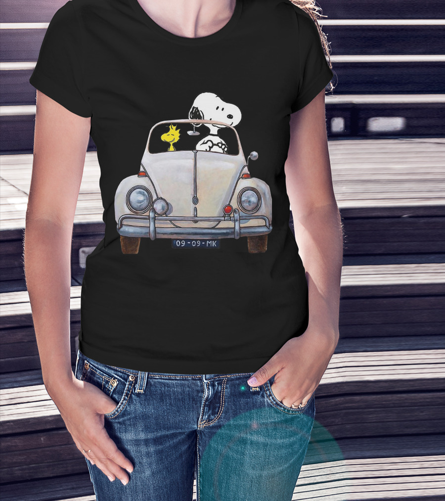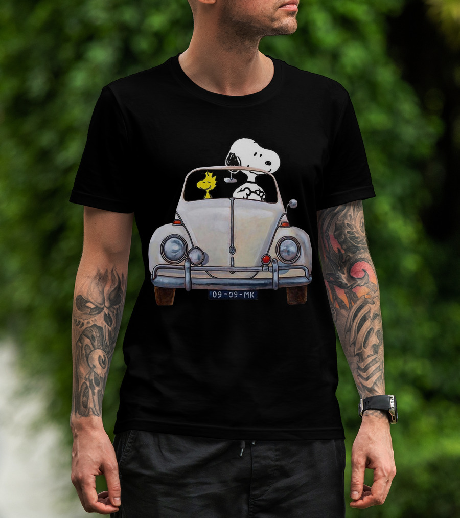 Snoopy And Woodstock Riding In Classic Volkswagen Beetle Car T-Shirt