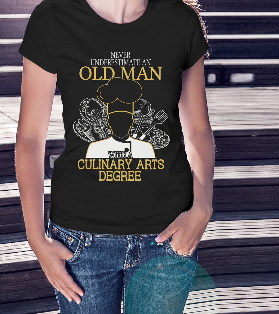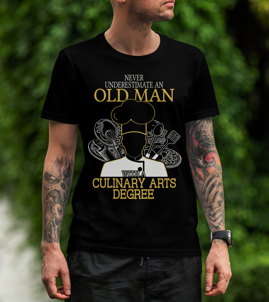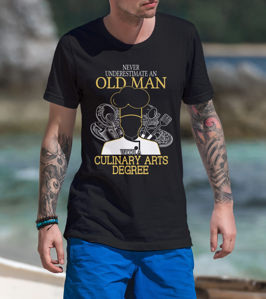 Never Underestimate An Old Man With A Culinary Arts Degree Chef Hat And Cooking Utensils T-Shirt