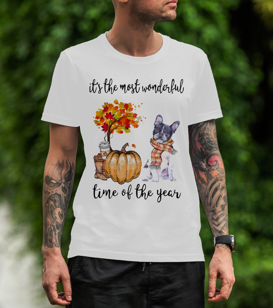 Its The Most Wonderful Time Of The Year Boston Terrier Autumn Pumpkin Leaves Coffee T-Shirt