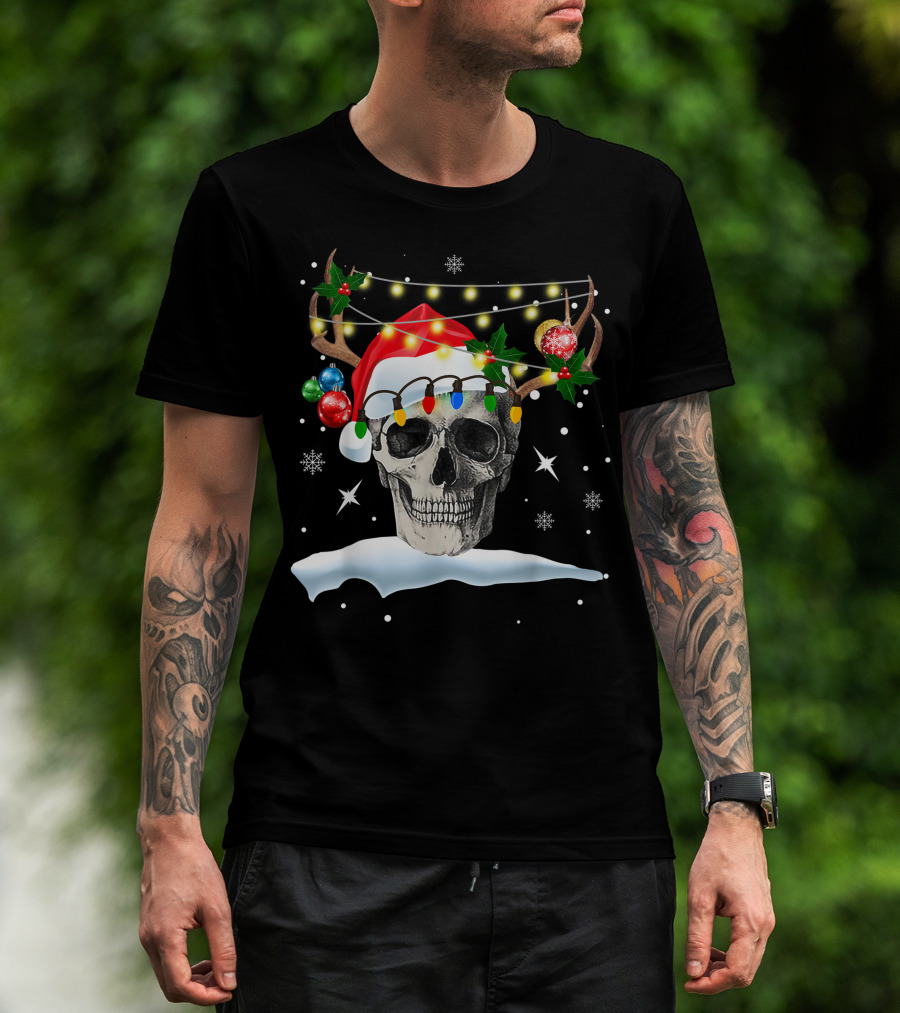 Skull Reindeer Christmas Funny Santa Hat Antlers Holiday Lights Snowflakes T-Shirt