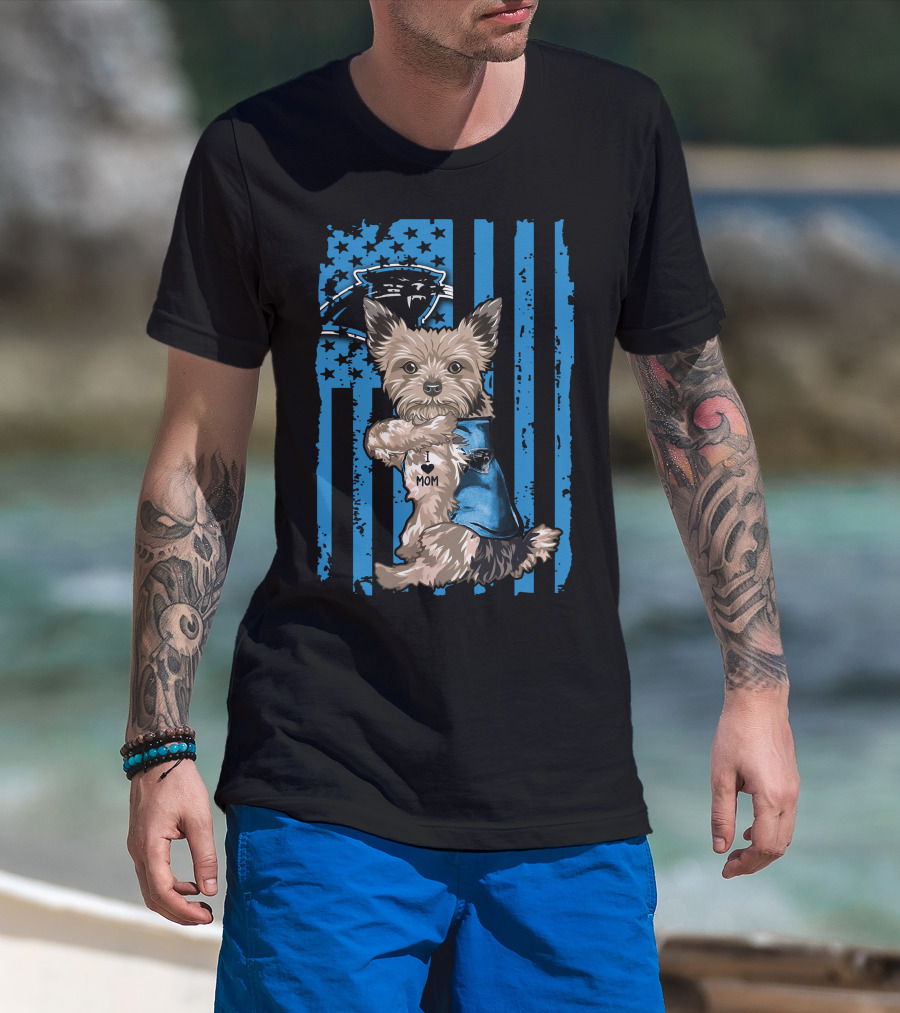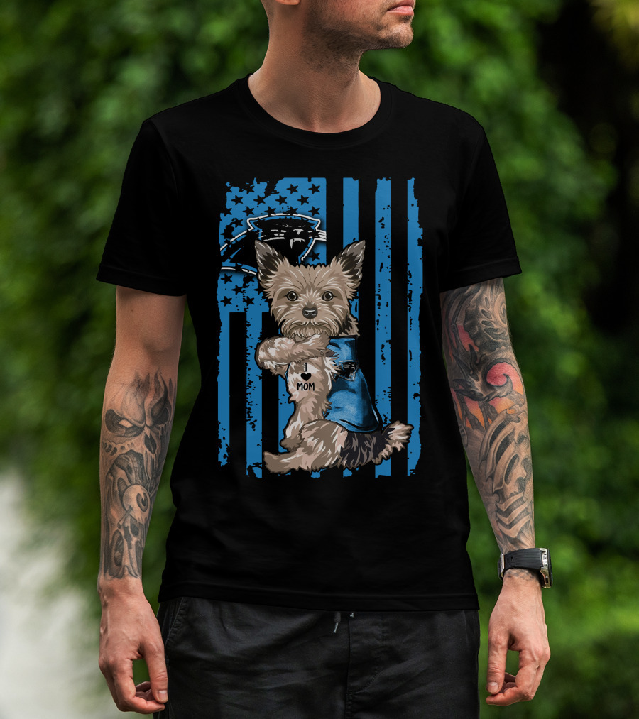 Yorkshire Terrier I Love Mom With Carolina Panthers Flag T-Shirt