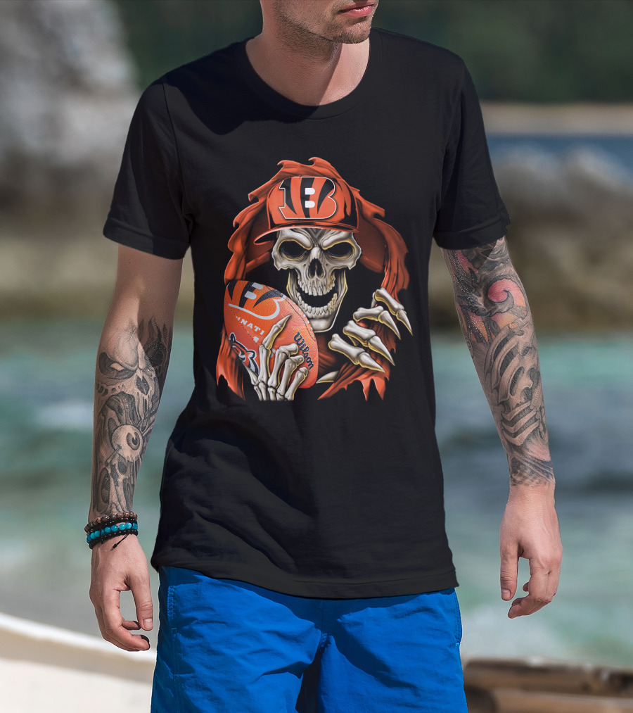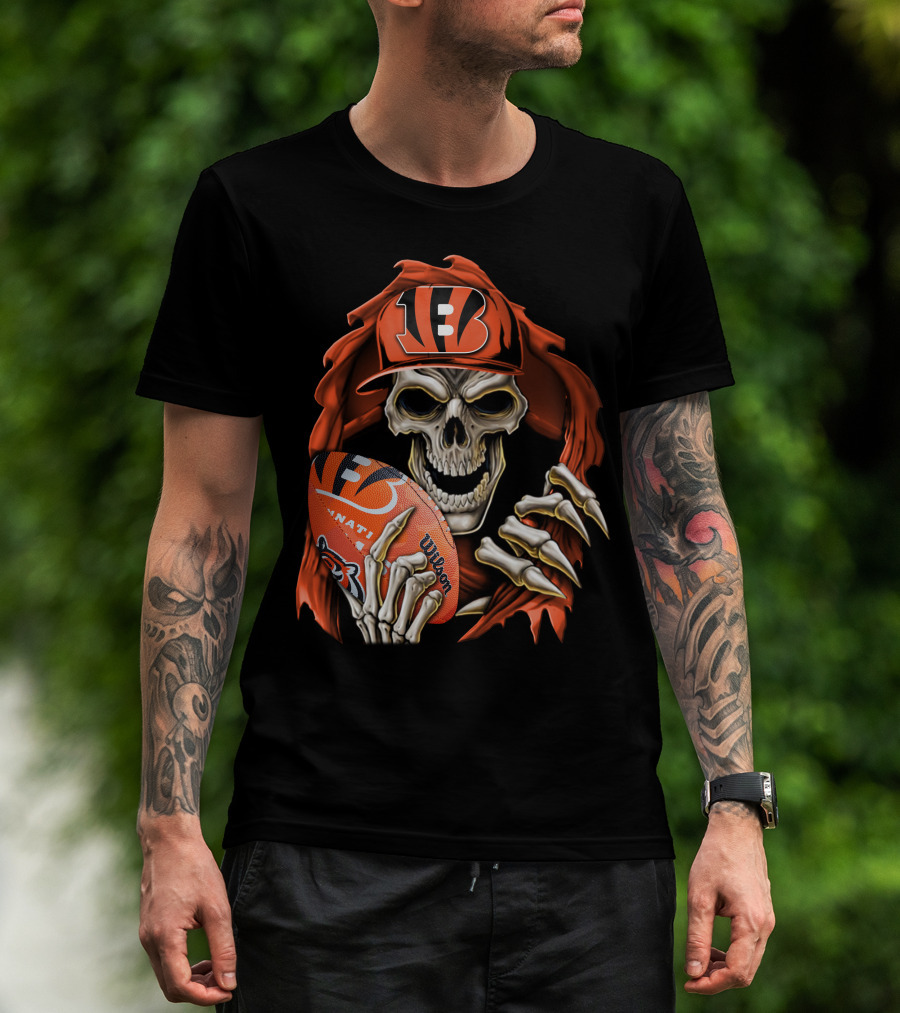 Skullbong Cincinnati Bengals Skeleton Holding Football T-Shirt