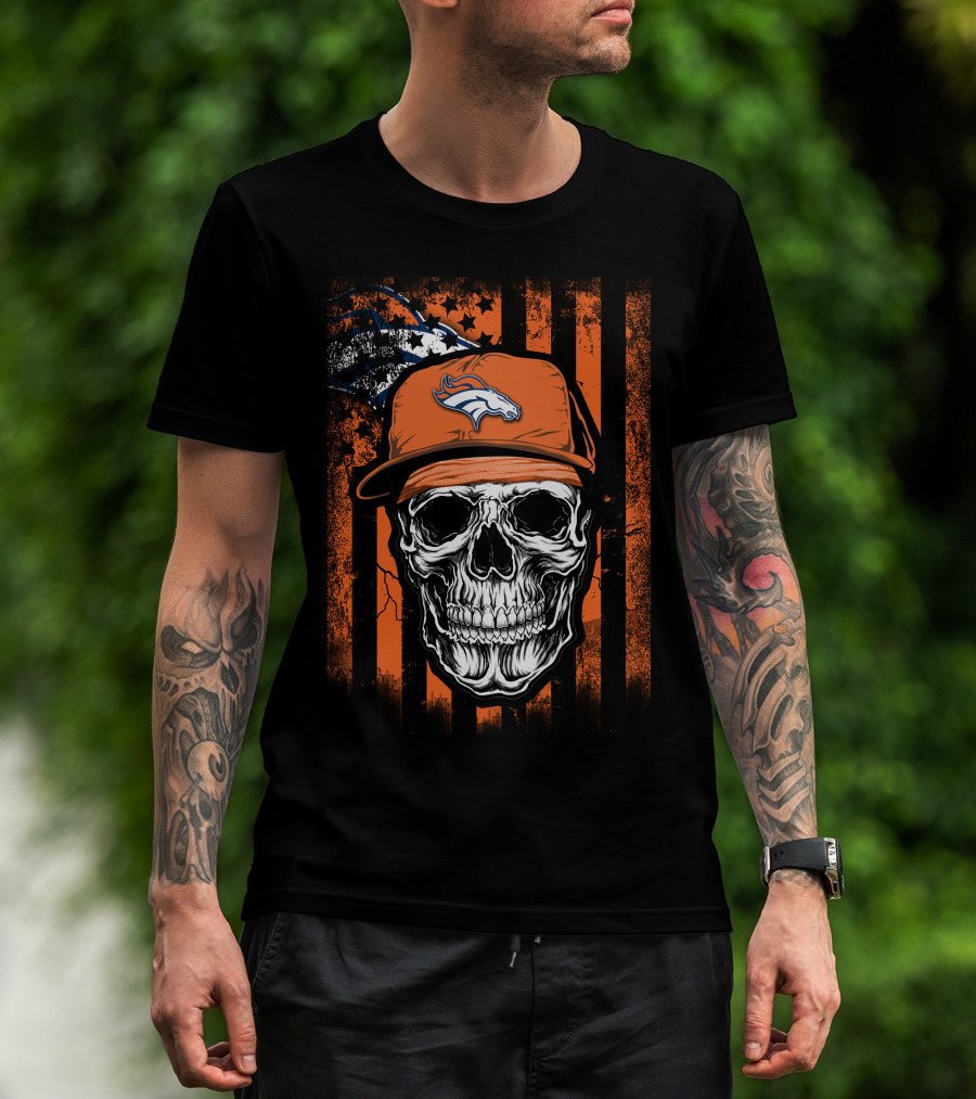 Skull Wearing Denver Broncos Cap On Grunge Orange Stripes T-Shirt