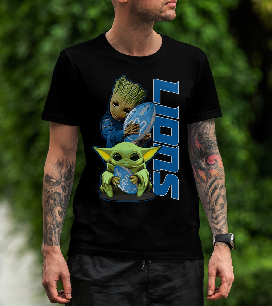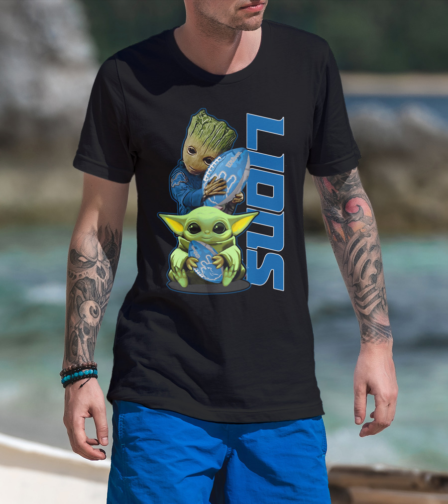 Grzd DETROIT LIONS Baby Groot And Baby Yoda With Football T-Shirt
