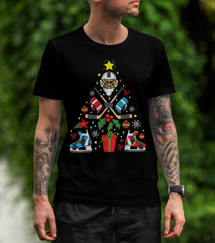 Ice Hockey Christmas Ornament Tree With Skates And Goalie Mask T-Shirt