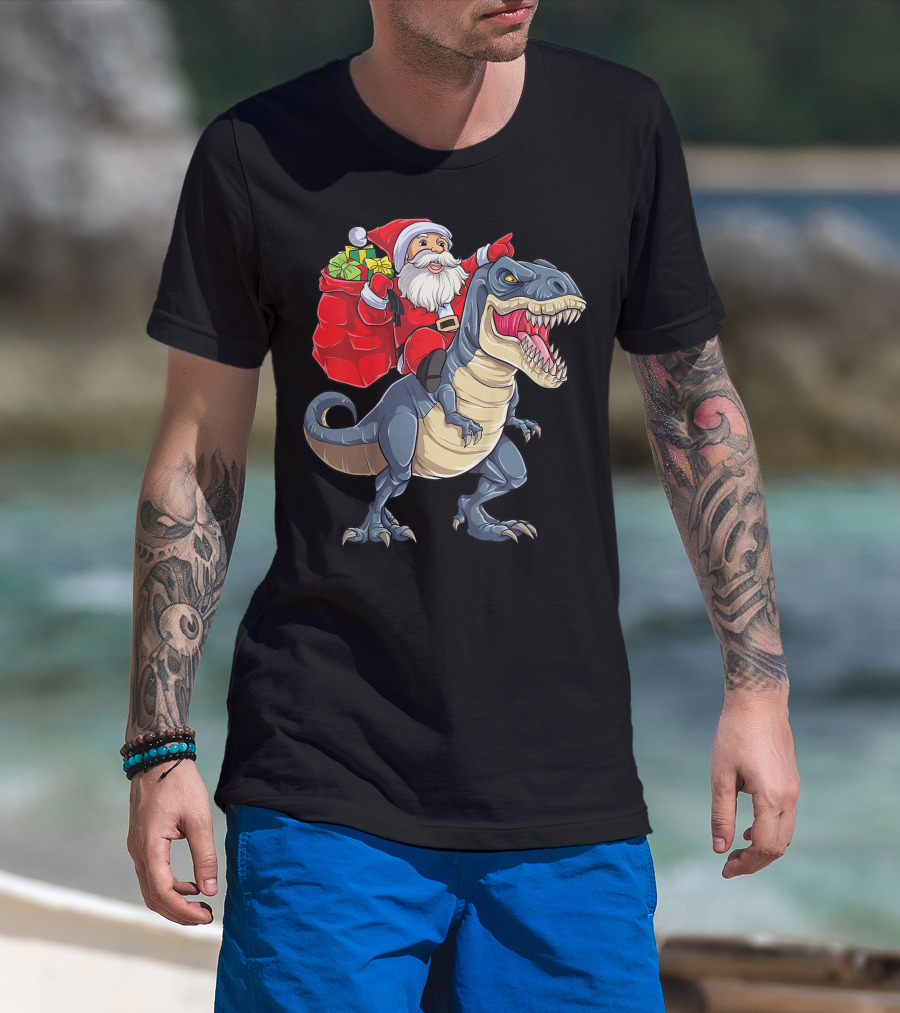 Santa Claus Riding T-Rex With Gifts T-Shirt