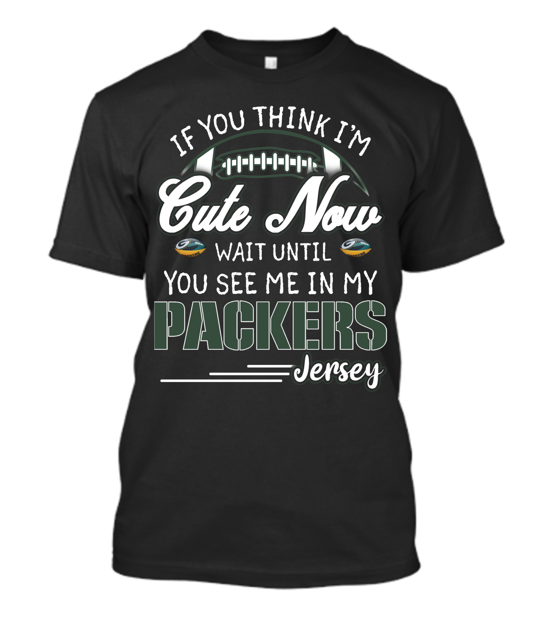 The If You Think I'm Cute Now Wait Until You See Me in My Packers Jersey T-shirt is designed for everyday wear and a consistent fit. Fabric is pre-shrunk ring-spun cotton with durable stitching. See the size chart below for exact measurements.