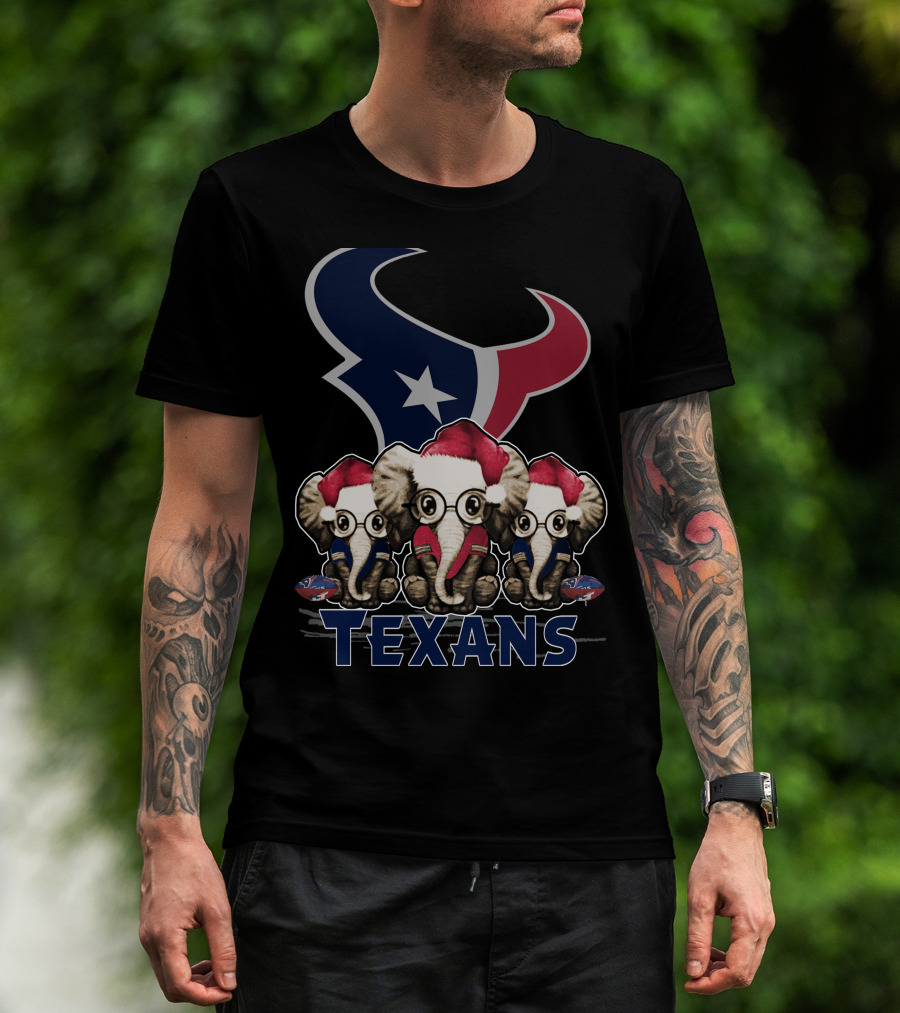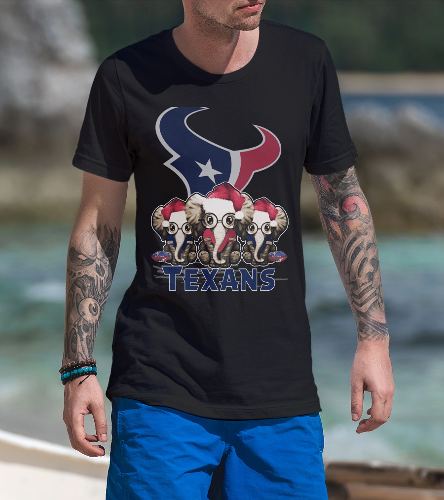 Houston Texans Elephant Xmas With Santa Hats And Glasses T-Shirt