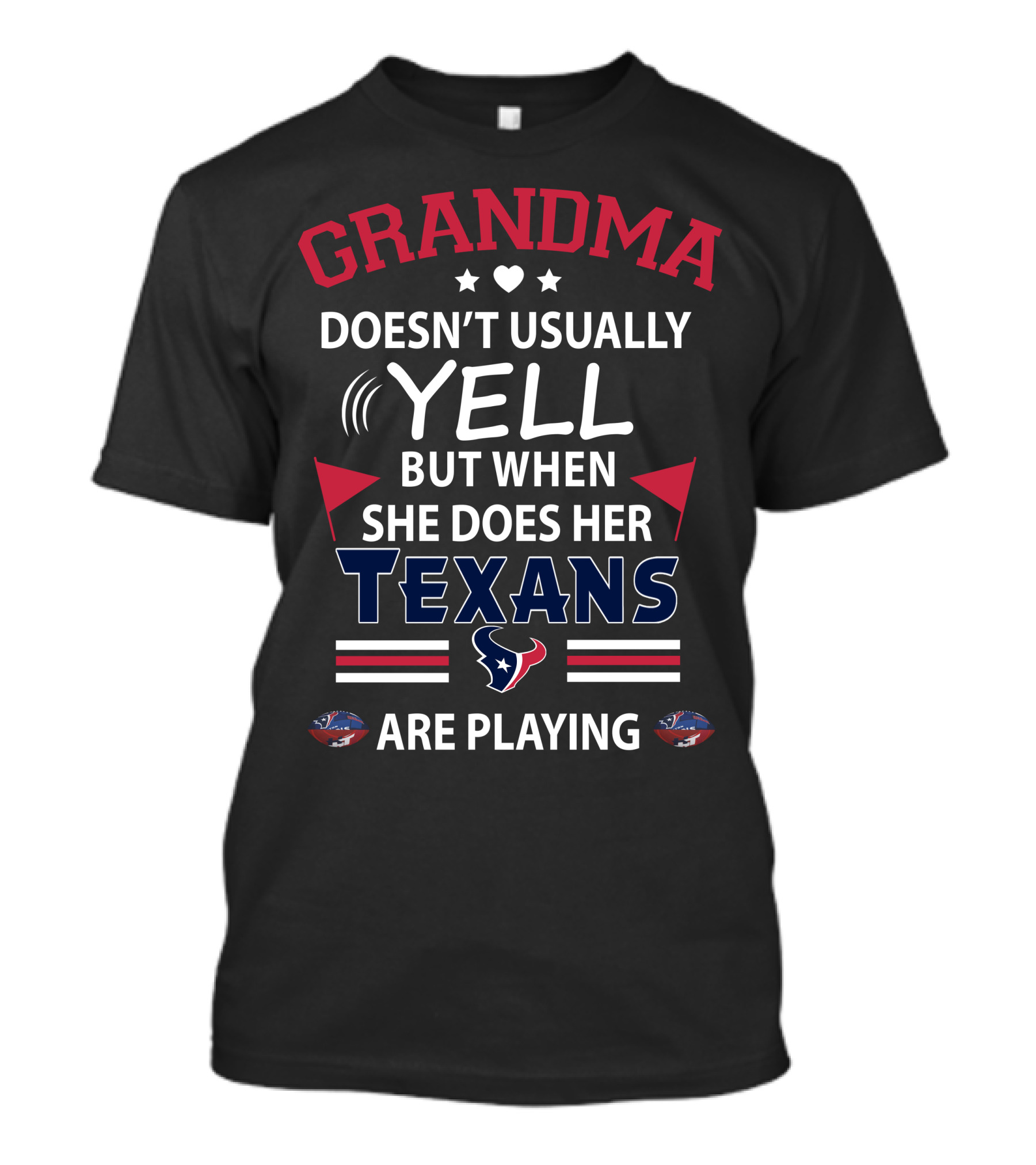 The Grandma Doesn't Usually Yell But When She Does Her Texans Are Playing T-shirt is designed for everyday wear and a consistent fit. Fabric is pre-shrunk ring-spun cotton with durable stitching. See the size chart below for exact measurements.