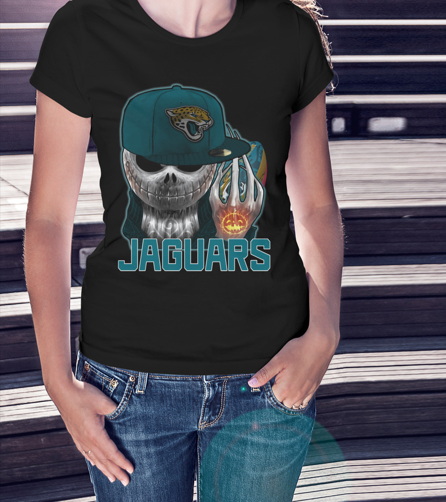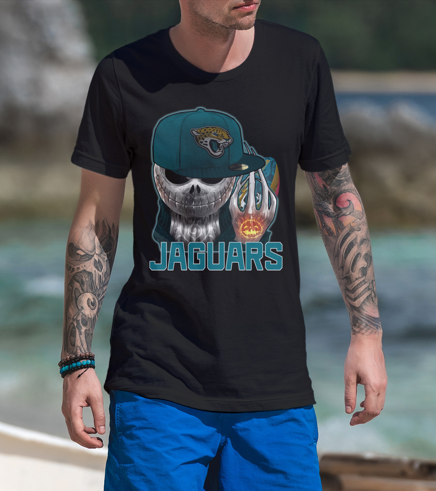 Jackskull Jaguars Halloween Skull Holding Pumpkin With Jaguars Logo Hat T-Shirt