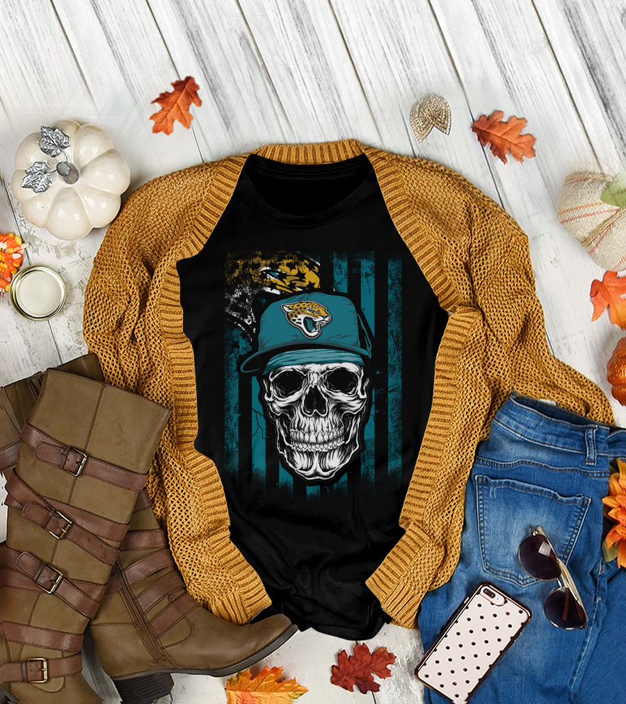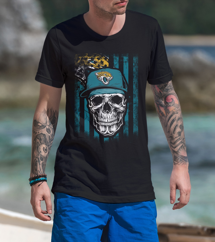 Skull In Jacksonville Jaguars Cap With Teal Stripes T-Shirt