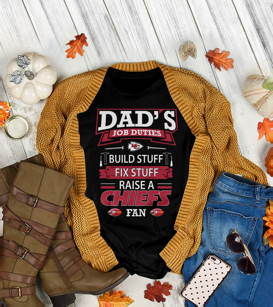 The Dad's Job Duties Build Stuff Fix Stuff Raise a Chiefs Fan Kansas City Chiefs T-shirt is designed for everyday wear and a consistent fit. Fabric is pre-shrunk ring-spun cotton with durable stitching. See the size chart below for exact measurements.