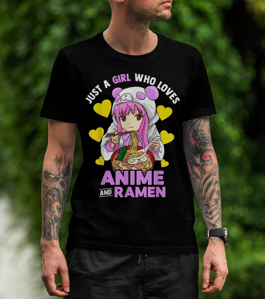 Just A Girl Who Loves Anime And Ramen Panda Hoodie Pink Hair T-Shirt