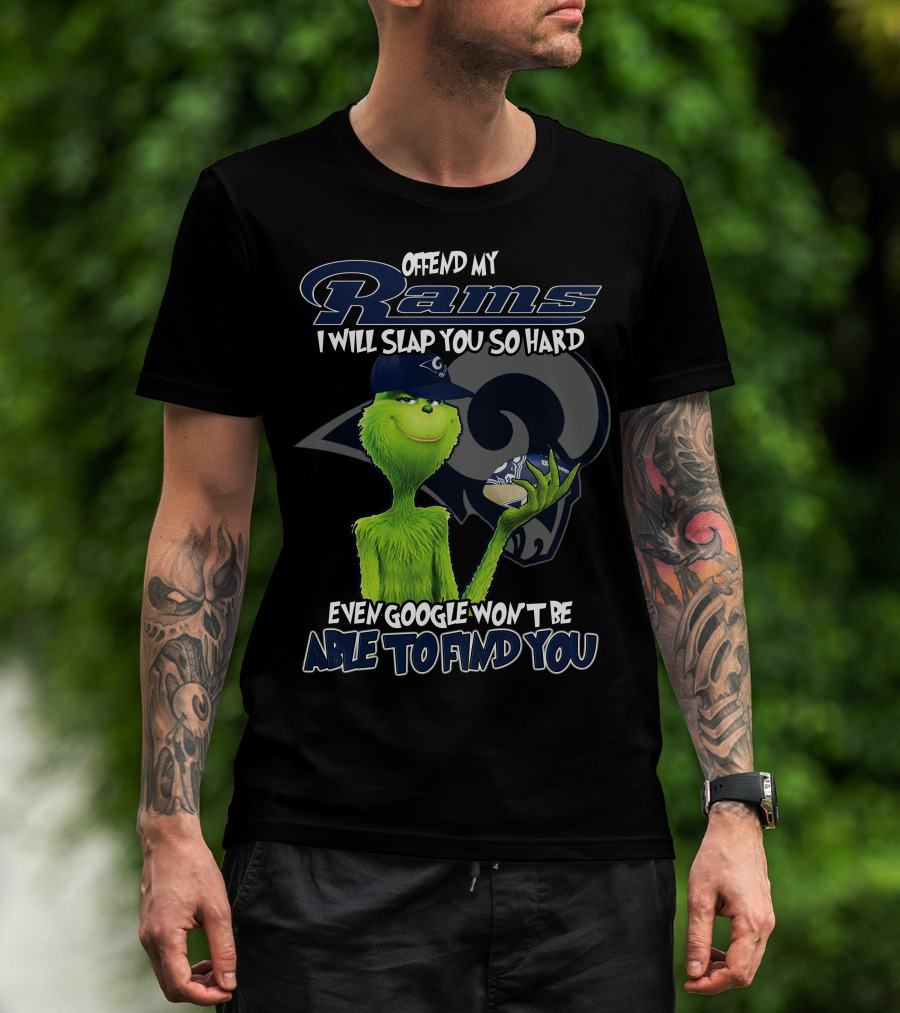 The Grinch Los Angeles Rams Offend My Rams I Will Slap You So Hard Even Google Won't Be Able to Find You T-shirt is designed for everyday wear and a consistent fit. Fabric is pre-shrunk ring-spun cotton with durable stitching. See the size chart below for exact measurements.