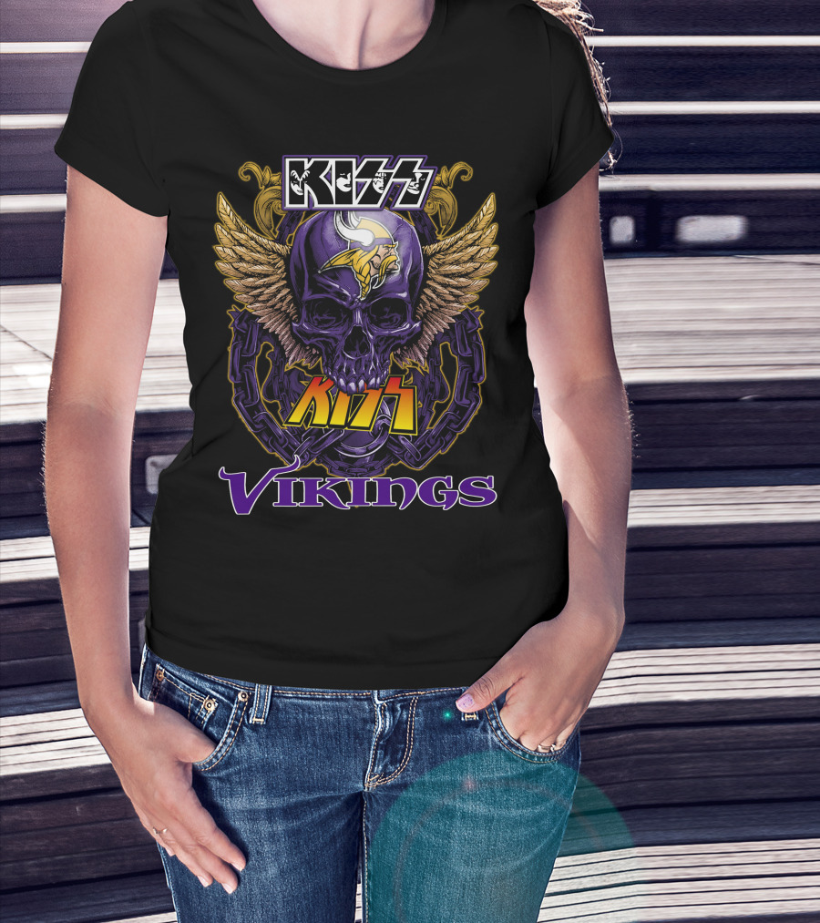 Kiss Vikings Skull With Minnesota Vikings Logo And Wings T-Shirt