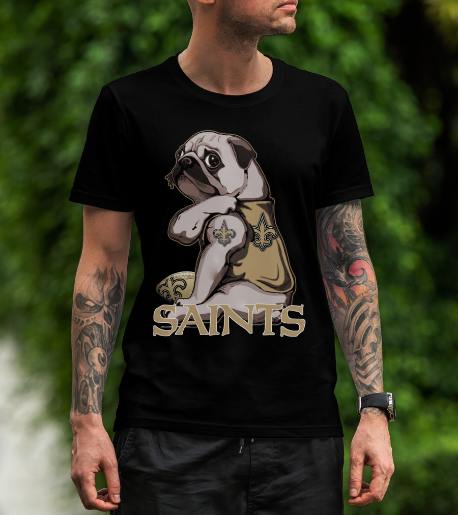 Pug Wearing New Orleans Saints Jersey With Fleur-de-Lis Tattoo And Football T-Shirt