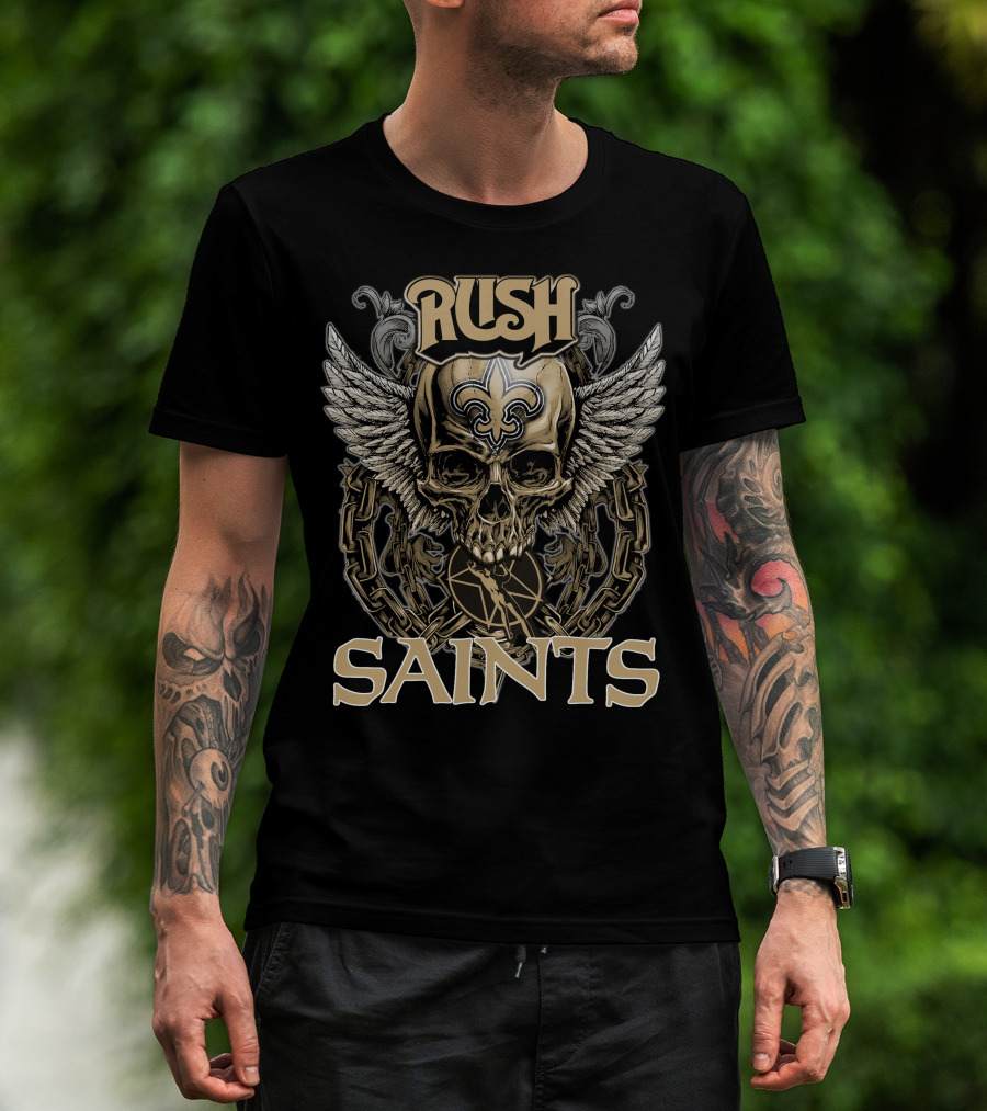 Rush New Orleans Saints Skull With Wings And Chains Fleur-de-Lis Emblem T-Shirt