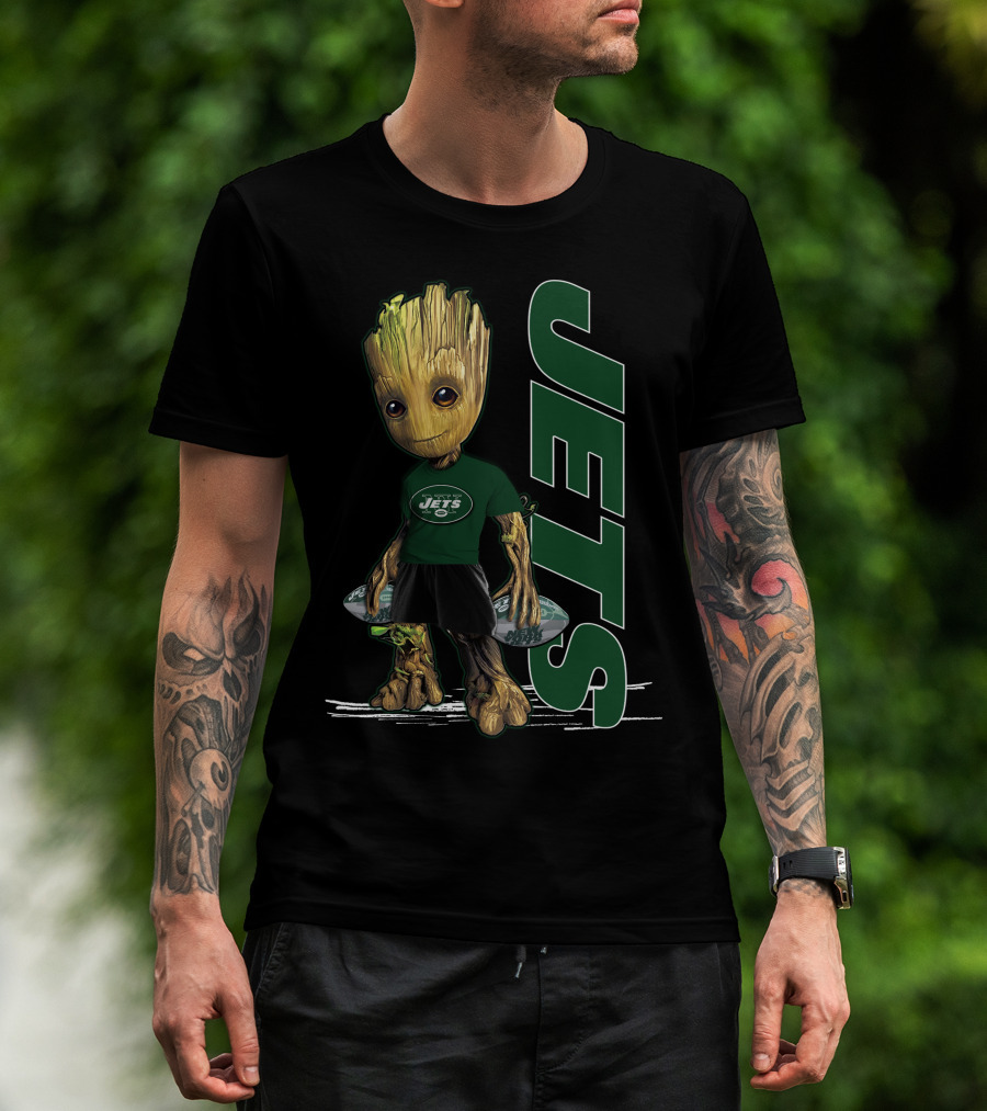 The Groot New York Jets NFL Football T-shirt is designed for everyday wear and a consistent fit. Fabric is pre-shrunk ring-spun cotton with durable stitching. See the size chart below for exact measurements.